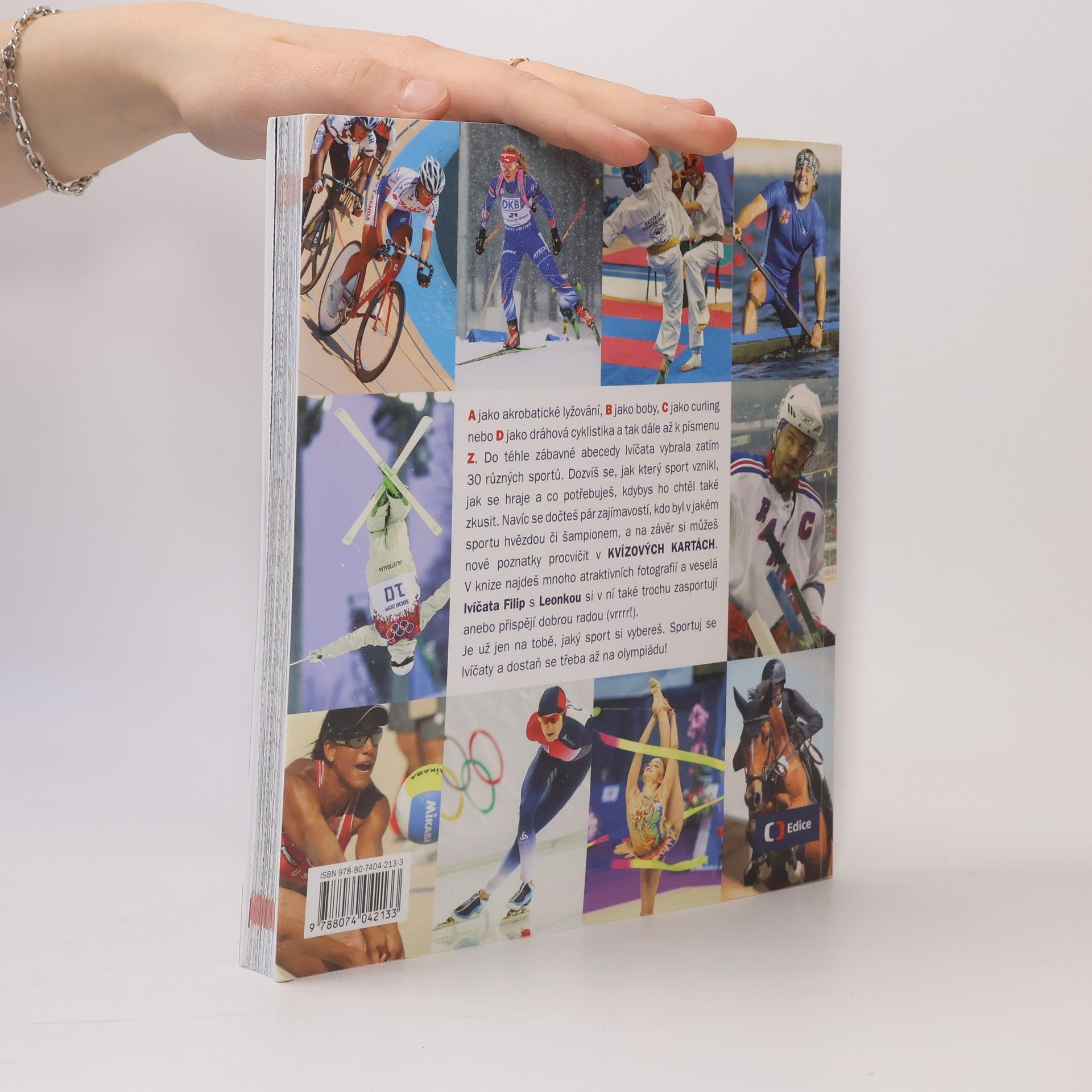 A jako akrobatické lyžování, B jako boby, C jako curling nebo D jako dráhová cyklistika a tak dále až k písmenu Z. Do téhle zábavné abecedy autoři vybrali zatím 30 různých sportů. Čtenáři se dozvědí, jak který sport vznikl, jak se hraje a jaké vybavení potřebují, kdyby si ho chtěli také zkusit. Navíc se dočtou pár zajímavostí, kdo byl v jakém sportu hvězdou či šampionem, a na závěr si mohou nové poznatky procvičit v KVÍZOVÝCH KARTÁCH. Popsané sporty doprovází mnoho atraktivních fotografií a veselá lvíčata Filip s Leonkou si v ní také trochu zasportují anebo přispějí dobrou radou. Je už jen na čtenářích, jaký sport si vyberou. Sportováním se lvíčaty se třeba dostanou až na olympiádu!