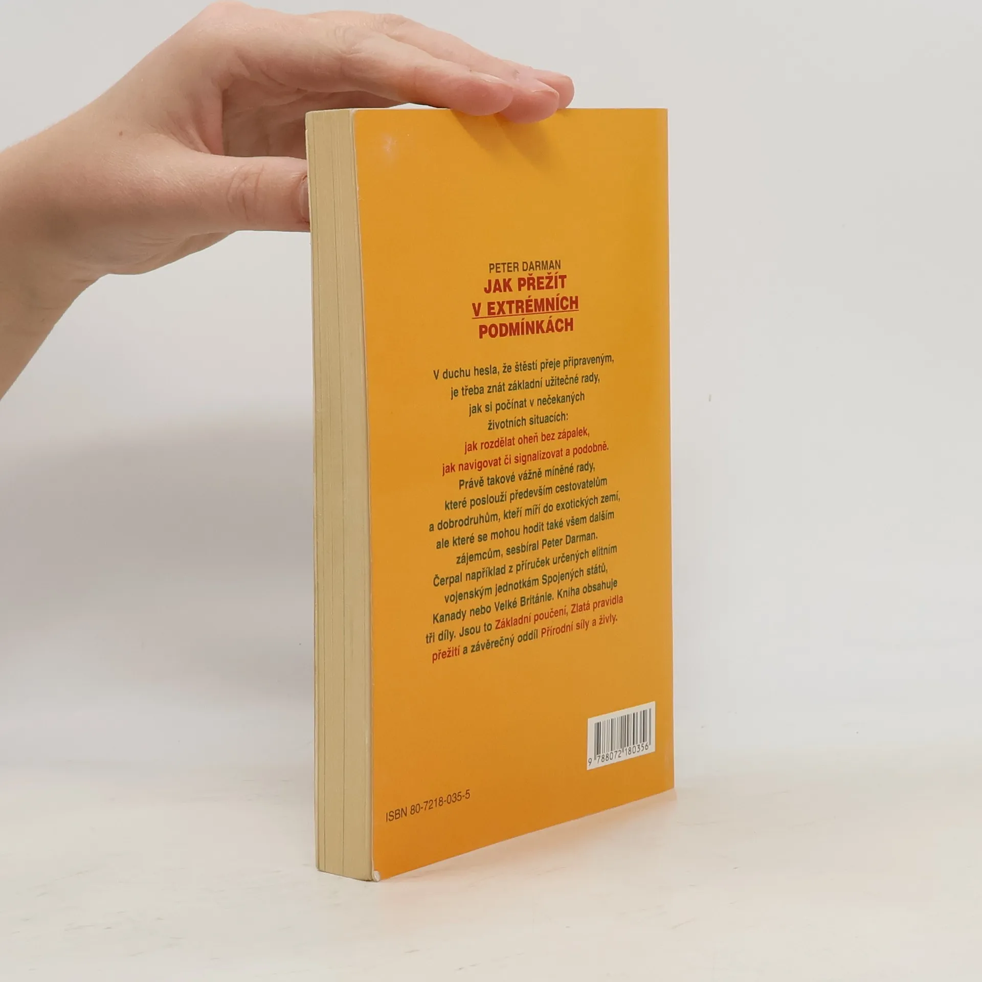 Rady, které poslouží cestovatelům do exotických zemí. Kniha je rozdělena do tří dílů: Základní poučení, Zlatá pravidla, Přírodní síly a živly. V duchu hesla, že štěstí přeje připraveným je třeba znát základní užitečné rady, jak si počínat v nečekaných životních situacích : jak rozdělat oheň bez zápalek, jak navigovat či signalizovat. Právě takové rady sesbíral Peter Darman. Čerpal například z příruček určeným elitním vojenským jednotkám Spojených států, Kanady nebo Velké Británie. Z anglického originálu, vydaného nakladatelstvím Brown Packaging Books Ltd, London přeložil Ing. Bruno Cempírek. Vydání první.