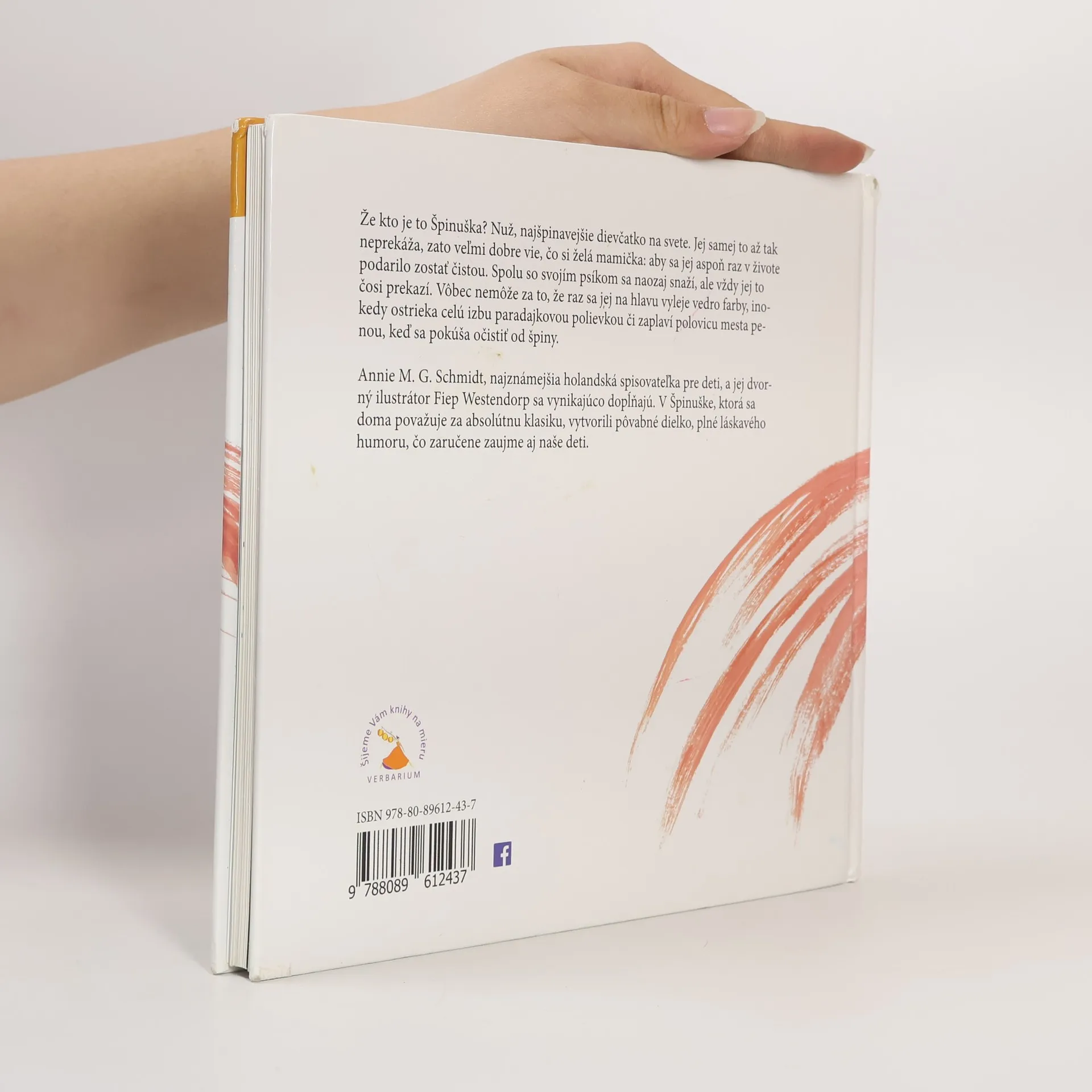 Špinuška v koupelně, Špinuška u kadeřníka, Špinuška v kuchyni, Špinuška při úklidu, Špinuška na návštěvě... ze všeho, co Špinuška a její pes podniknou, vznikne parádní binec. Nicméně i tak bude Špinuška na konci svých dobrodružství odměněna čestnou stuhou od starosty. Nejznámější nizozemská autorka knih pro děti A. M.G. Schmidtová přináší humorné příběhy holčičky, která nevydrží čistá déle než půl hodiny, doplněné úchvatnými ilustracemi F. Westendorpové.