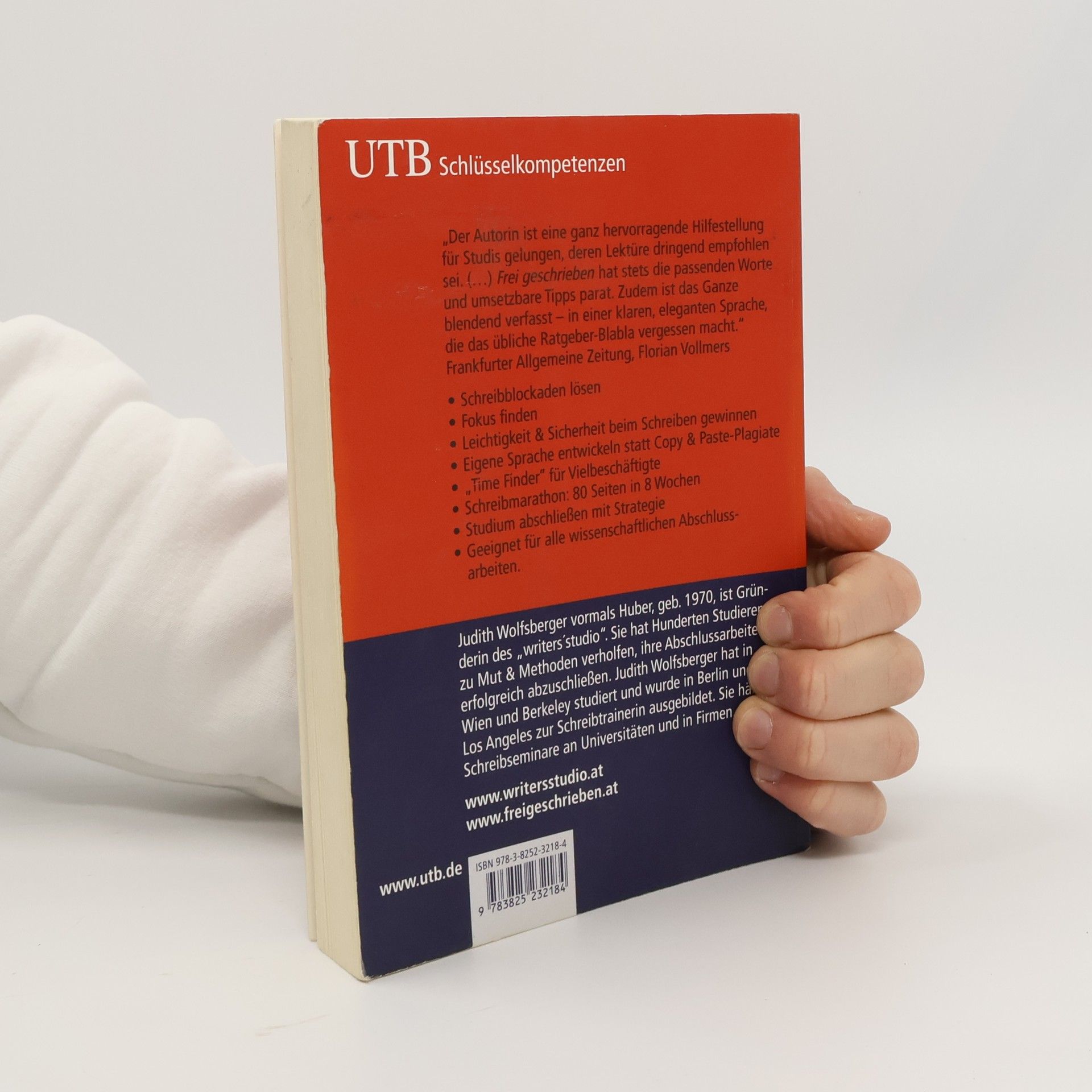In diesem Buch geht es um MUT. Und um die innere FREIHEIT und die pragmatischen STRATEGIEN, die es neben dem Mut noch braucht, um eine gute wissenschaftliche Abschlussarbeit zu schreiben und den Schreibprozess als produktiv und spannend zu erleben. „Frei geschrieben“ heißt nicht nur selbst geschrieben, es heißt auch durch Schreiben Potenziale freizusetzen und dadurch frei zu werden für die nächsten Schritte im Leben, nachdem man sich von der Uni „freigeschrieben“ hat.• Schreibblockaden lösen• Fokus finden• Leichtigkeit & Sicherheit beim Schreiben gewinnen• Eigene Sprache entwickeln statt Copy & Paste-Plagiate• „Time Finder“ für Vielbeschäftigte• Schreibmarathon: 80 Seiten in 8 Wochen• Studium abschließen mit Strategie• Geeignet für alle wissenschaftlichen Abschlussarbeiten.Judith Wolfsberger vormals Huber, geb. 1970, ist Gründerin des „writers´studio“. Sie hat Hunderten Studierenden zu Mut & Methoden verholfen, ihre Abschlussarbeiten erfolgreich abzuschließen.Judith Wolfsberger hat in Wien und Berkeley studiert und wurde in Berlin und Los Angeles zur Schreibtrainerin ausgebildet. Sie hält Schreibseminare an Universitäten und in Firmen.