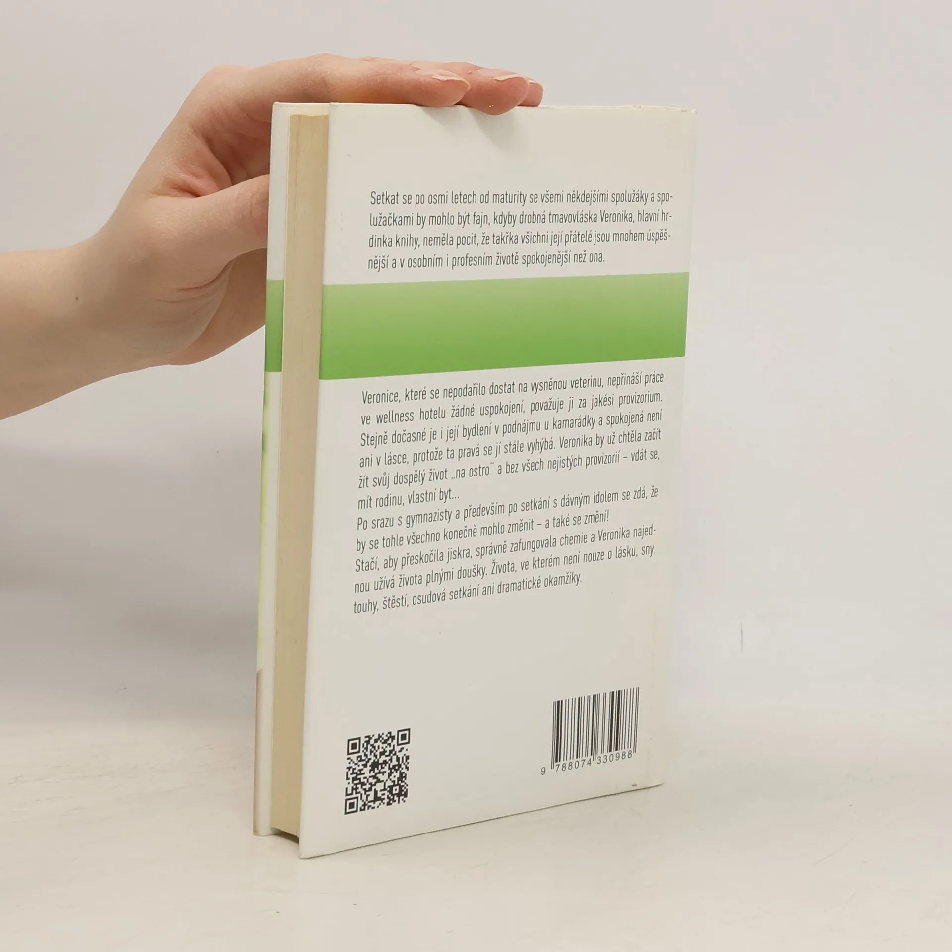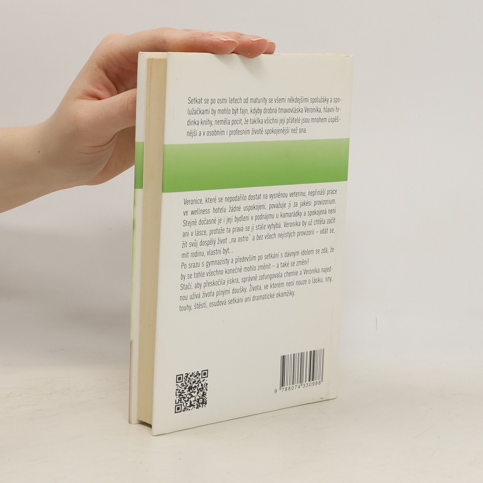 Setkat se po osmi letech od maturity se všemi někdejšími spolužáky a spolužačkami by mohlo být fajn, kdyby drobná tmavovláska Veronika, hlavní hrdinka knihy, neměla pocit, že takřka všichni její přátelé jsou mnohem úspěšnější a v osobním i profesním životě spokojenější než ona. Veronice, které se nepodařilo dostat na vysněnou veterinu, nepřináší práce ve wellness hotelu žádné uspokojení, považuje ji za jakési provizorium. Stejně dočasné je i její bydlení v podnájmu u kamarádky a spokojená není ani v lásce, protože ta pravá se jí stále vyhýbá. Veronika by už chtěla začít žít svůj dospělý život „na ostro“ a bez všech nejistých provizorií – vdát se, mít rodinu, vlastní byt... Po srazu s gymnazisty a především po setkání s dávným idolem se zdá, že by se tohle všechno konečně mohlo změnit – a také se změní! Stačí, aby přeskočila jiskra, správně zafungovala chemie a Veronika najednou užívá života plnými doušky. Života, ve kterém není nouze o lásku, sny, touhy, štěstí, osudová setkání ani dramatické okamžiky.
