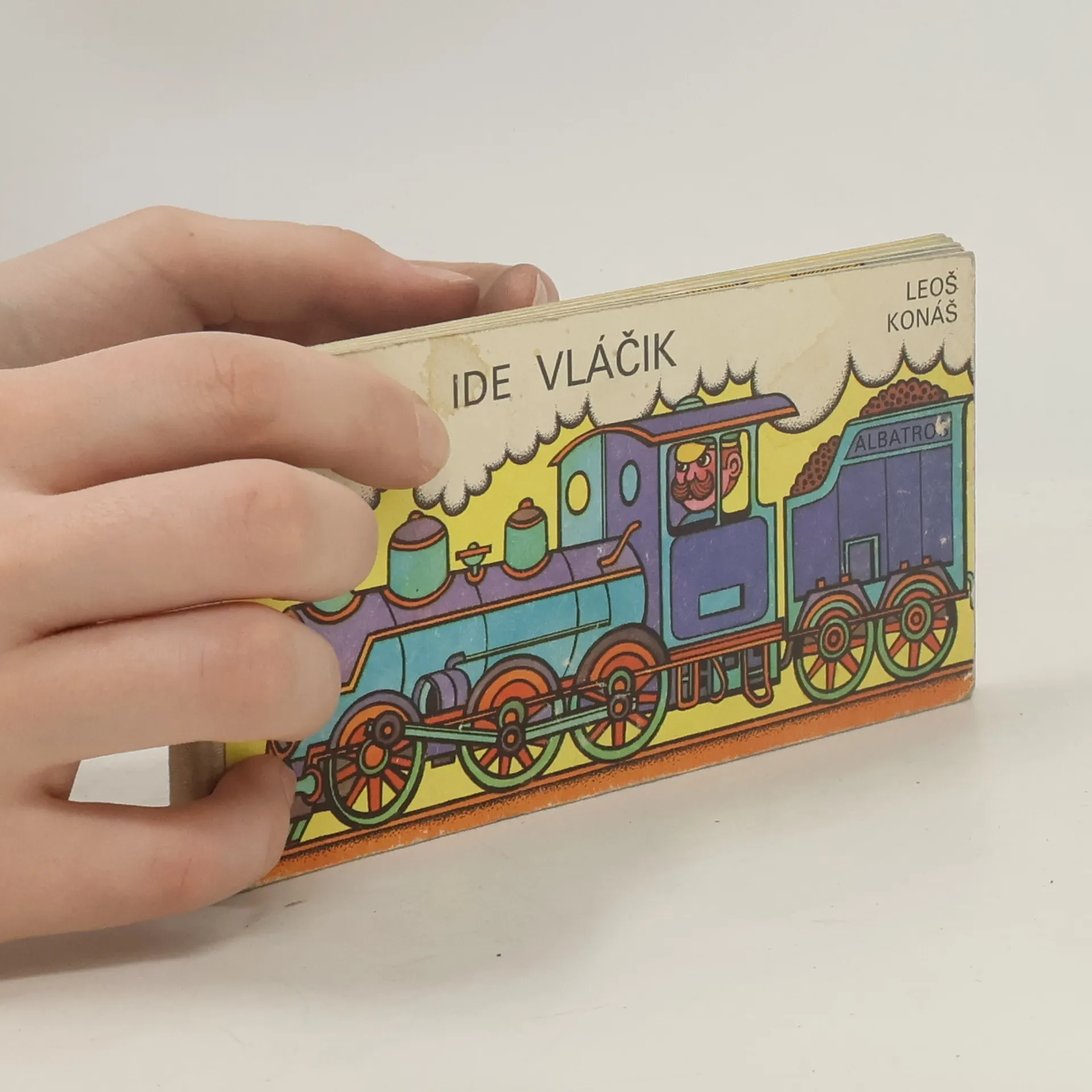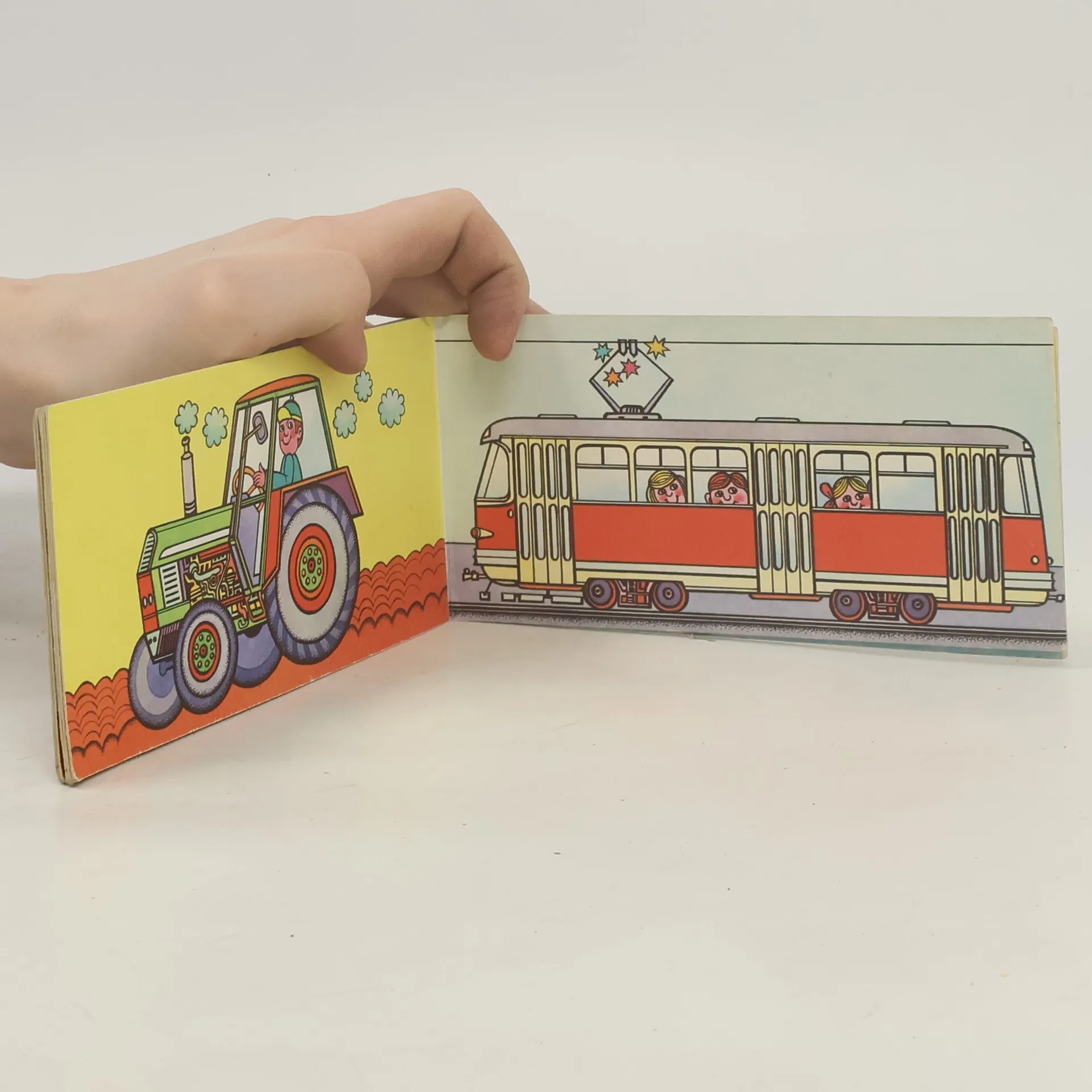 Malé obrázkové leporelo s různými dopravními prostředky od kočárku po letadlo, bez textu.