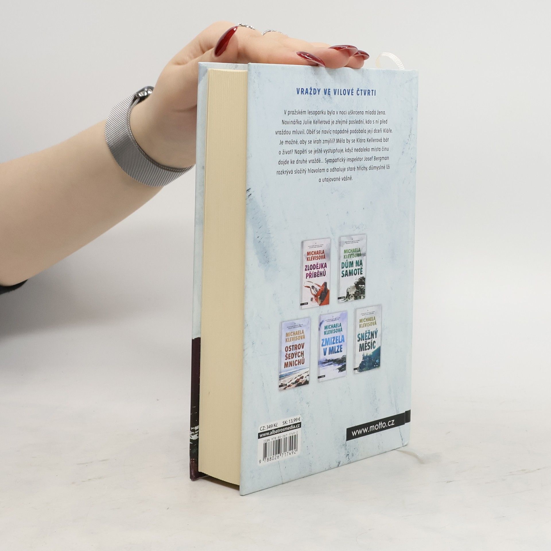 Nový případ inspektora Josefa Bergmana! Nový případ inspektora Josefa Bergmana! V pražském lesoparku byla v noci uškrcena mladá žena. Novinářka Julie Kellerová je zřejmě poslední, kdo s ní před vraždou mluvil. Oběť se navíc nápadně podobala její dceři Kláře. Je možné, aby se vrah zmýlil? Měla by se Klára Kellerová bát o život? Napětí se ještě vystupňuje, když nedaleko místa činu dojde ke druhé vraždě… Sympatický inspektor Josef Bergman rozkrývá složitý hlavolam a odhaluje staré hříchy, důmyslné lži a utajované vášně. Michaela Klevisová (*1976 v Praze) Vystudovala žurnalistiku na Fakultě sociálních věd Univerzity Karlovy a od roku 1997 pracuje jako novinářka. Jejím největším koníčkem je cestování a psaní reportáží z míst, která navštívila. Její prvotina Kroky vraha (2007) sklidila mimořádný úspěch a dostala za ni Cenu Jiřího Marka. Úspěšný byl i její druhý detektivní román Zlodějka příběhů (2009) a také třetí, Dům na samotě (2011), který jí vynesl opět Cenu Jiřího Marka. Zatím posledním detektivním románem je Ostrov šedých mnichů (2015). Kromě detektivních příběhů vydala také dvě knihy příběhů o kočkách Čekání na kocoura (2012)a Kocour z Montmartru (2013).