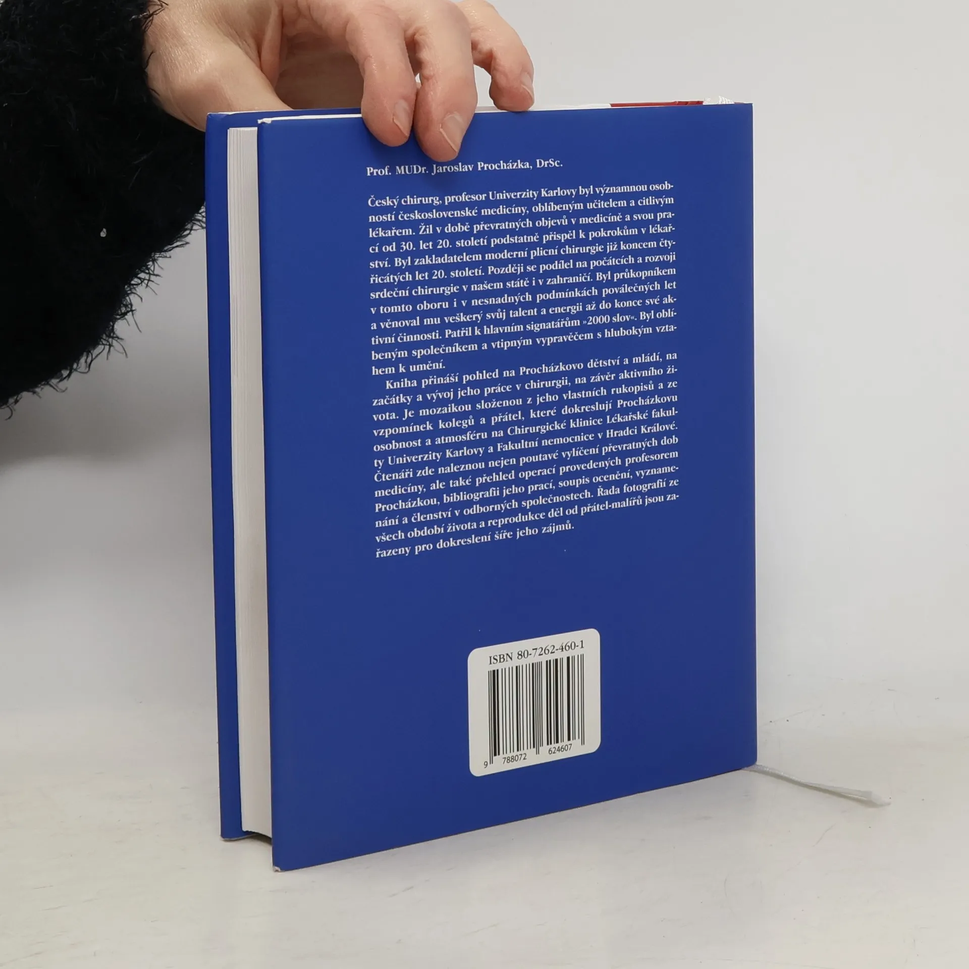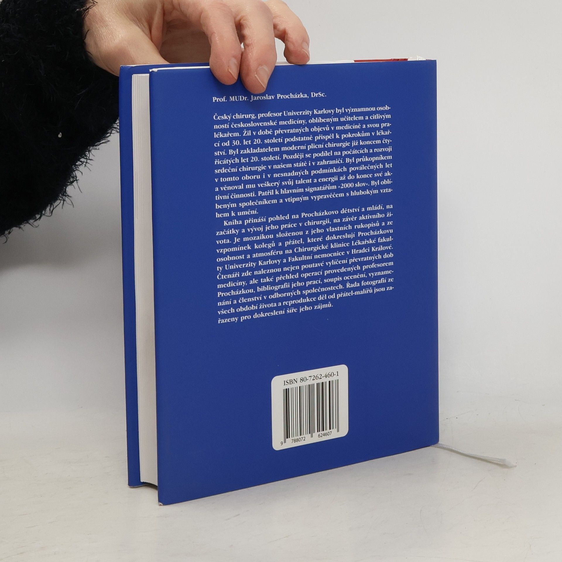 Prof. MUDr. Jaroslav Procházka, DrSc., český chirurg, byl významnou osobností československé medicíny. Byl zakladatelem moderní plicní chirurgie již koncem 40. let 20. stol., později se podílel na rozvoji srdeční chirurgie v našem státě i v zahraničí. Kniha přináší pohled na Procházkovo dětství a mládí, na začátky a vývoj jeho práce v chirurgii, na závěr aktivního života. Je mozaikou složenou z jeho vlastních rukopisů a ze vzpomínek kolegů a přátel, které dokreslují Procházkovu osobnost a atmosféru na Chirurgické klinice LF UK a FN v H. Králové. Čtenáři zde naleznou nejen poutavé vylíčení převratných dob medicíny, ale také přehled operací provedených profesorem Procházkou, bibliografii jeho prací, soupis ocenění, vyznamenání a členství v odborných společnostech.