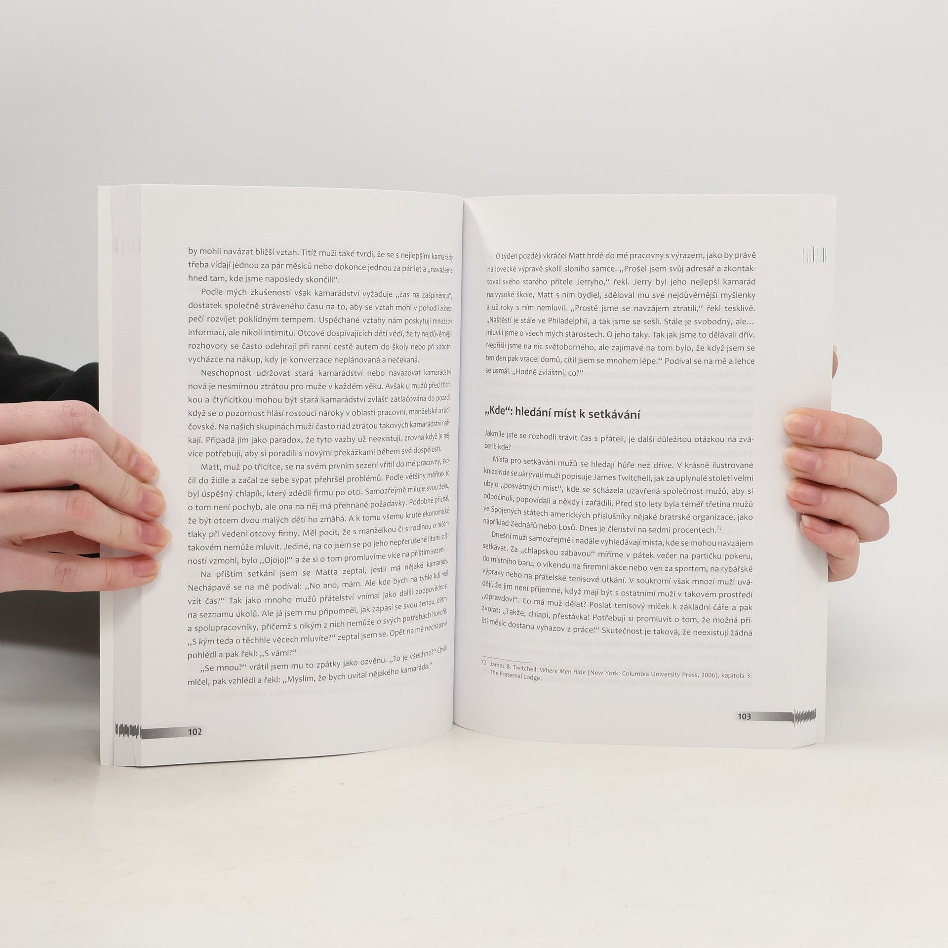 Klíč k mužským emocím. V minulosti se muži řídili tím, co autor nazývá mužským kódem – pevným souborem vodítek a norem, které vedly muže ke stoicismu, tichosti a síle. Změny mužské role v posledních desetiletích vyvíjejí na muže tlak, aby přestali své emoce skrývat. Zkušený psychoterapeut zkoumá jedinečné výzvy, jimž dnešní muži čelí, vybízí je k opuštění mužského kódu a rozvíjení mužství, které slučuje tradiční mužské vlastnosti s dovednostmi emoční intimity. Ve svých „laboratořích přátelství“ vybízí muže, aby s ostatními muži vytvořili pouto založené na čtyřech pravidlech – kontaktu, komunikaci, závazku a spolupráci – jako základu smysluplných vztahů. Vychází ze skutečných příběhů i výzkumných poznatků a ukazuje, že důvěrné přátelství může být základem pro budování a udržení hlubokých vztahů se všemi blízkými, včetně partnerek, dětí a rodičů, a umožňuje mužům vést šťastnější a zdravější život.