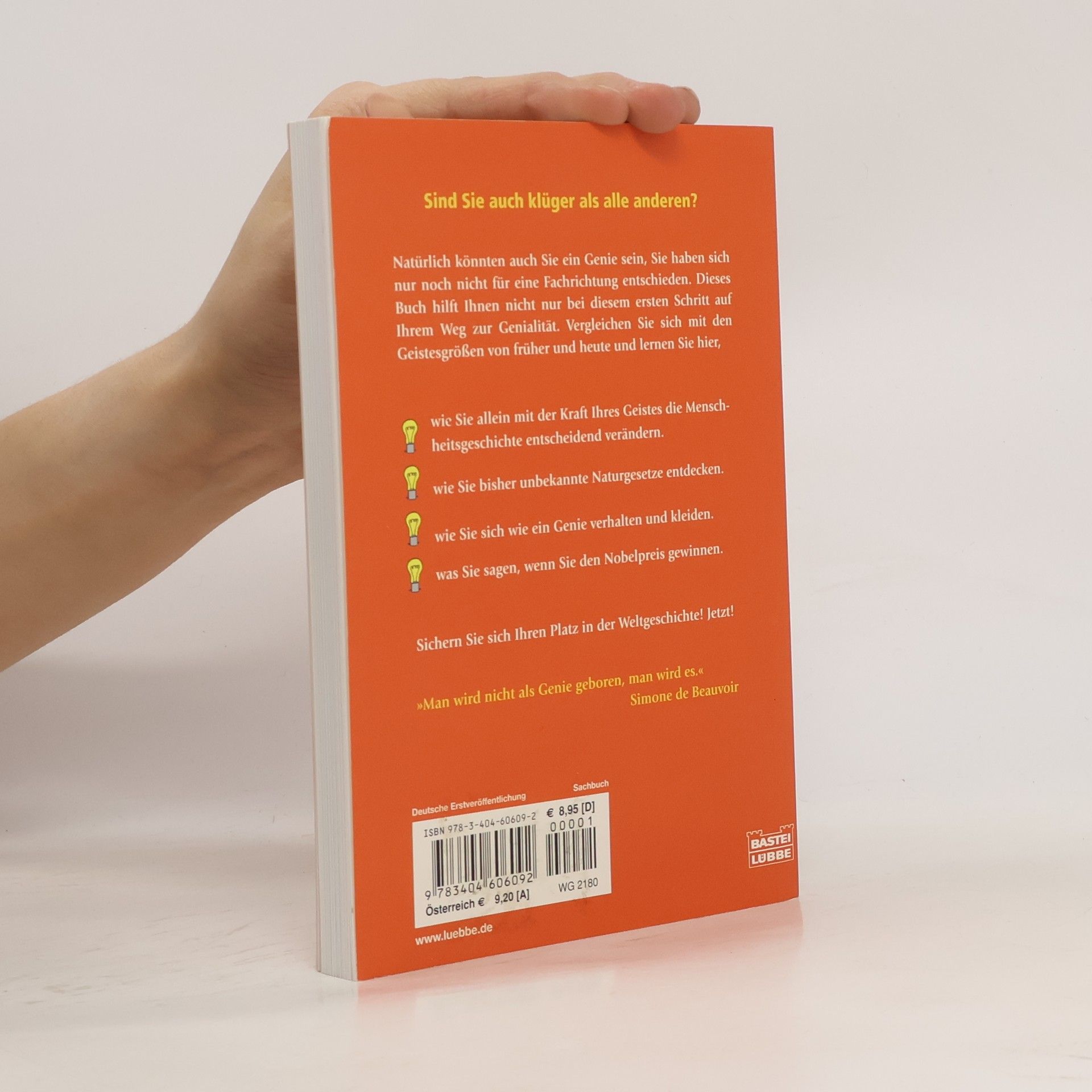 Natürlich könnten auch Sie ein Genie sein, Sie haben sich nur noch nicht für eine Fachrichtung entschieden. Dieses Buch hilft Ihnen nicht nur bei diesem ersten Schritt auf Ihrem Weg zur Genialität. Vergleichen Sie sich mit den Geistesgrößen von früher und heute und lernen Sie hier, wie Sie allein mit der Kraft Ihres Geistes die Menschheitsgeschichte entscheidend verändern, wie Sie bisher unbekannte Naturgesetze entdecken, wie Sie sich wie ein Genie verhalten und kleiden, was Sie sagen, wenn Sie den Nobelpreis gewinnen, und vieles mehr. Sichern Sie sich Ihren Platz in der Weltgeschichte! Jetzt!