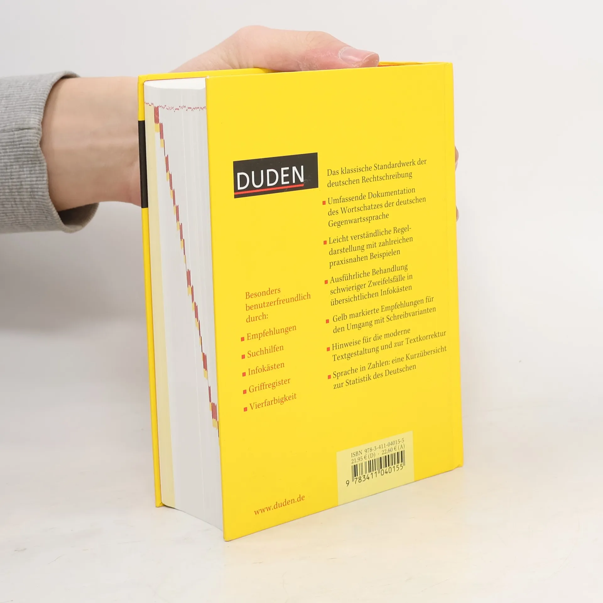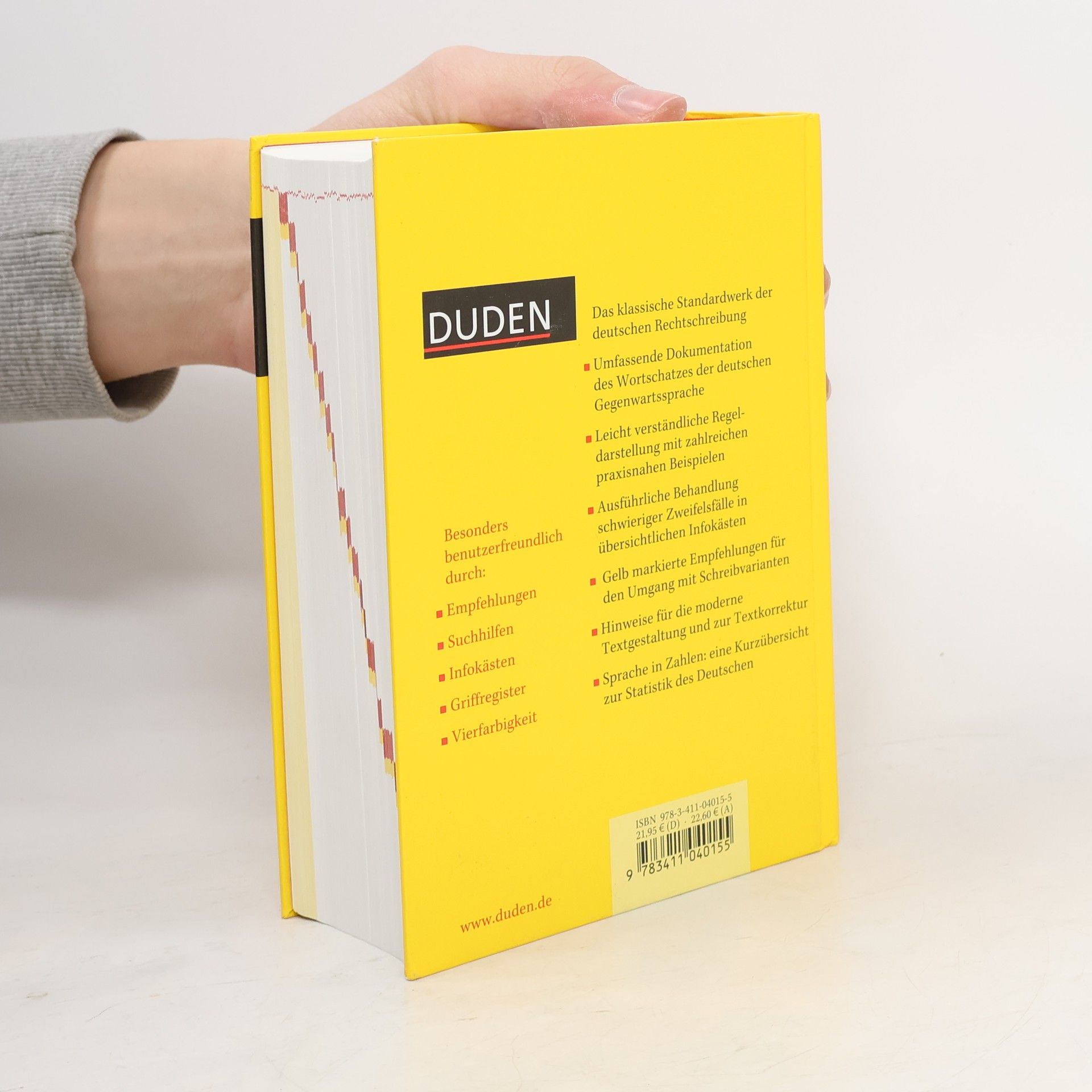 Die 25. Auflage des umfassenden Standardwerks ist so zuverlässig wie immer und so umfangreich wie nie zuvor: Rund 135.000 Stichwörter, davon 5.000 neue Wörter, über 500.000 Beispiele, Bedeutungserklärungen und Angaben zu Worttrennung, Aussprache, Grammatik, Etymologie und Stil lassen keine Fragen offen. In 400 übersichtlichen Infokästen werden schwierige Zweifelsfälle anhand von Beispielen ausführlich erklärt. Bei mehreren zulässigen Schreibweisen helfen gelb markierte Dudenempfehlungen. Neu: der Sonderteil mit wissenswerten Informationen rund um den Wortschatz der deutschen Sprache.