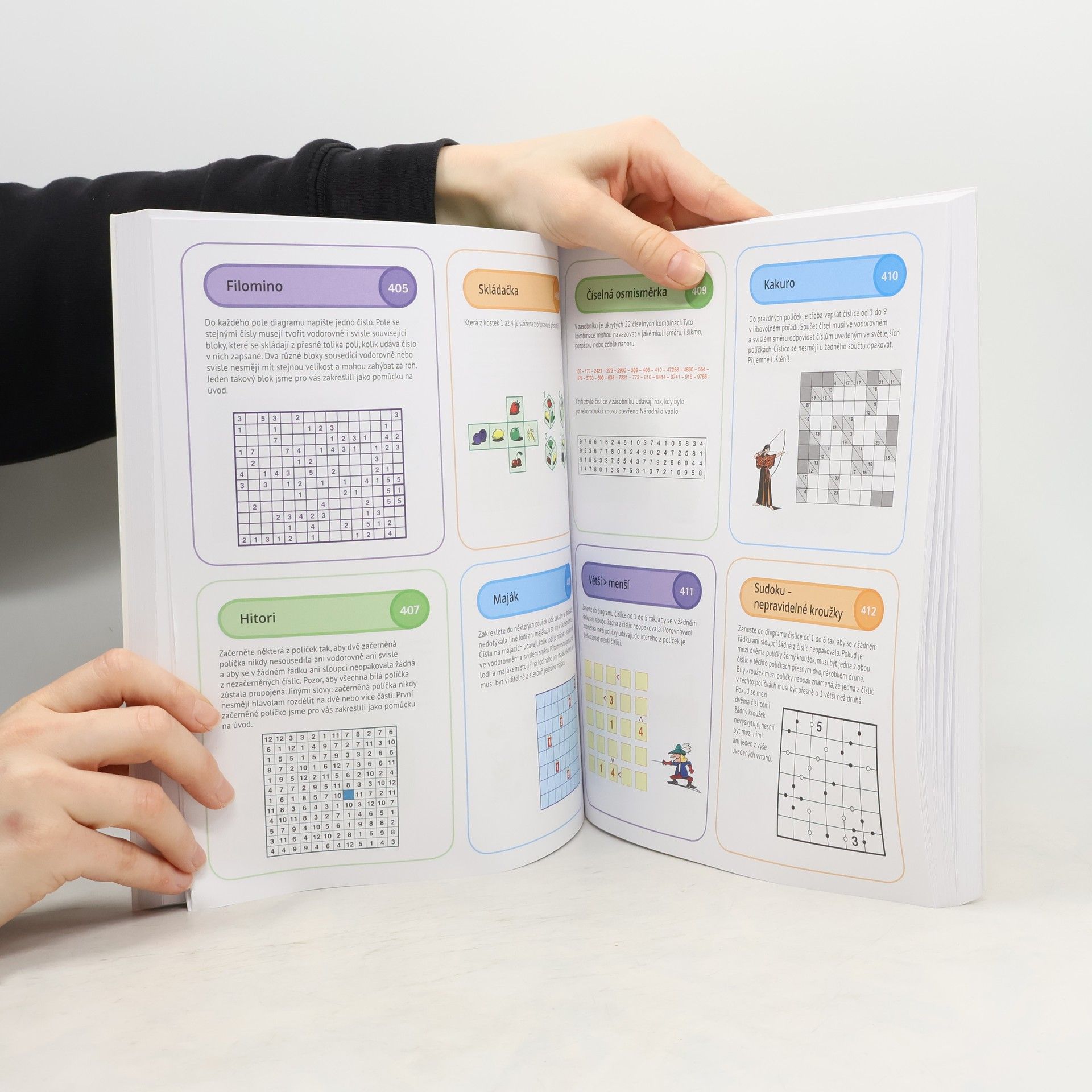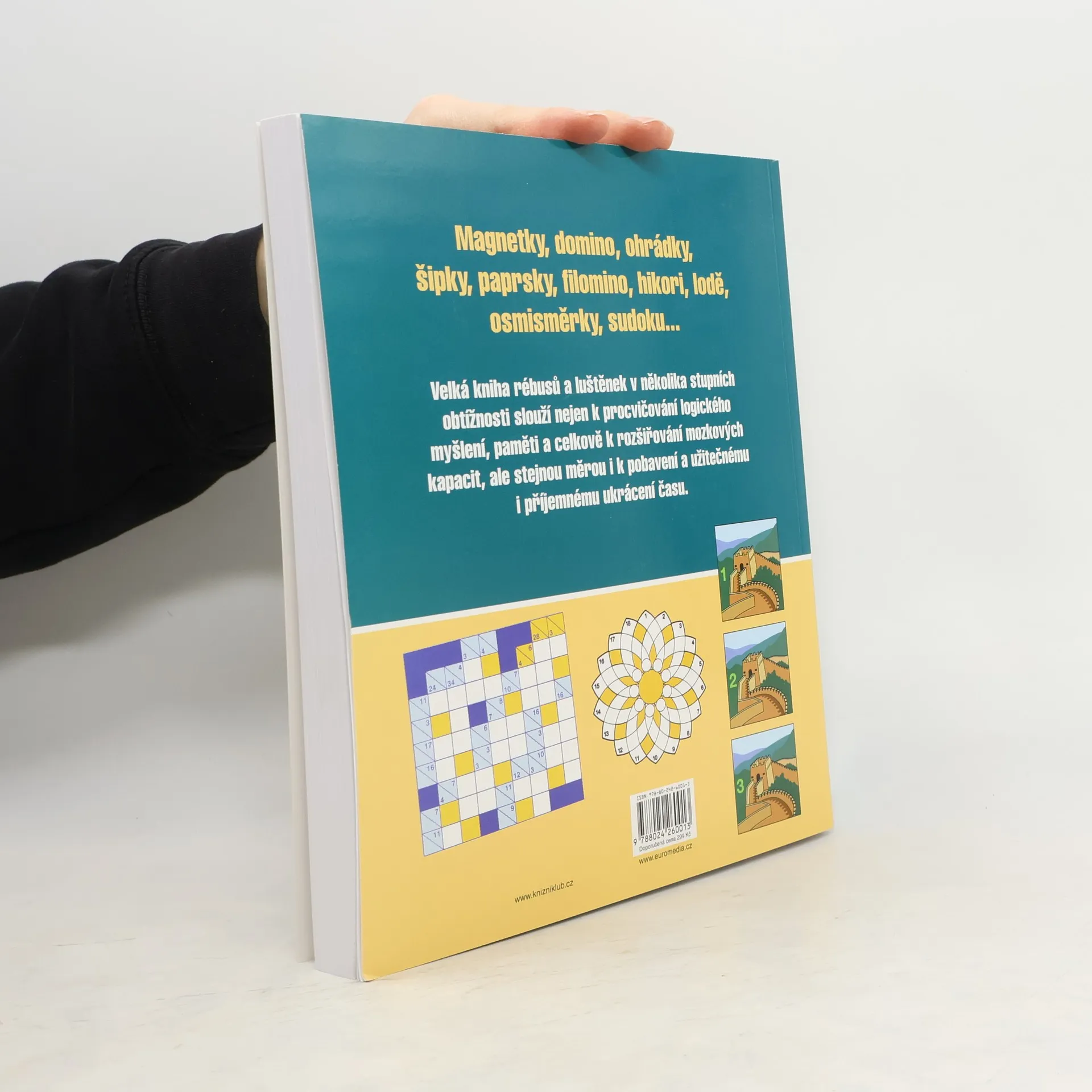 Magnetky, domino, ohrádky, šipky, paprsky, filomino, hikori, lodě, osmisměrky, sudoku... velká kniha rébusů a luštěnek v několika stupních obtížnosti slouží nejen k procvičování logického myšlení, paměti a celkově k rozšiřování mozkových kapacit, ale stejnou měrou i k pobavení a užitečnému i příjemnému ukrácení času.