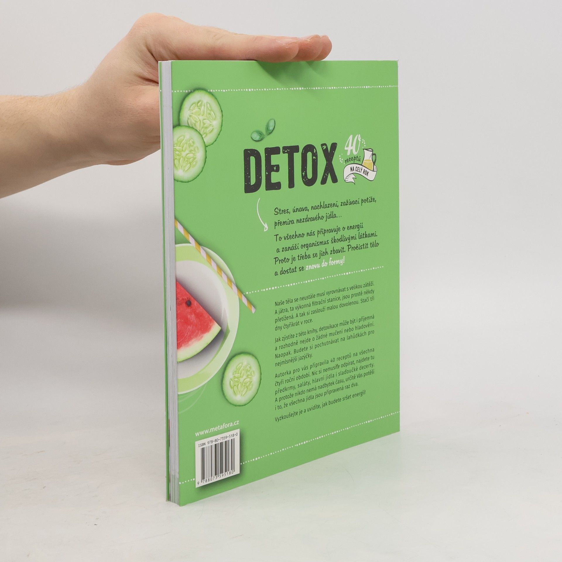 40 receptů na celý rok, které pomohou zbavit tělo škodlivých látek a získat zpět energii. Stres, únava, nachlazení, zažívací potíže, přemíra nezdravého jídla, to všechno nás připravuje o energii a zanáší organismus škodlivými látkami. Proto je třeba se jich zbavit. Pročistit tělo a dostat se znovu do formy! Taková detoxikace ale může být docela příjemná. A rozhodně nejde o žádné mučení nebo hladovění. Naopak. Budete si pochutnávat na lahůdkách pro nejmlsnější jazýčky. V téhle knize jsme pro vás připravili rovných 40 receptů na všechna čtyři roční období. Nic si nemusíte odpírat, najdete tu předkrmy, saláty, hlavní jídla i slaďoučké dezerty. A protože nikdo nemá nadbytek času, určitě potěší i to, že všechna jídla jsou připravená raz dva. Naše těla se neustále musejí vyrovnávat s velikou zátěží. A játra, ta výkonná filtrační stanice, jsou prostě někdy přetížená. A tak si zaslouží malou dovolenou. Stačí tři dny čtyřikrát v roce.