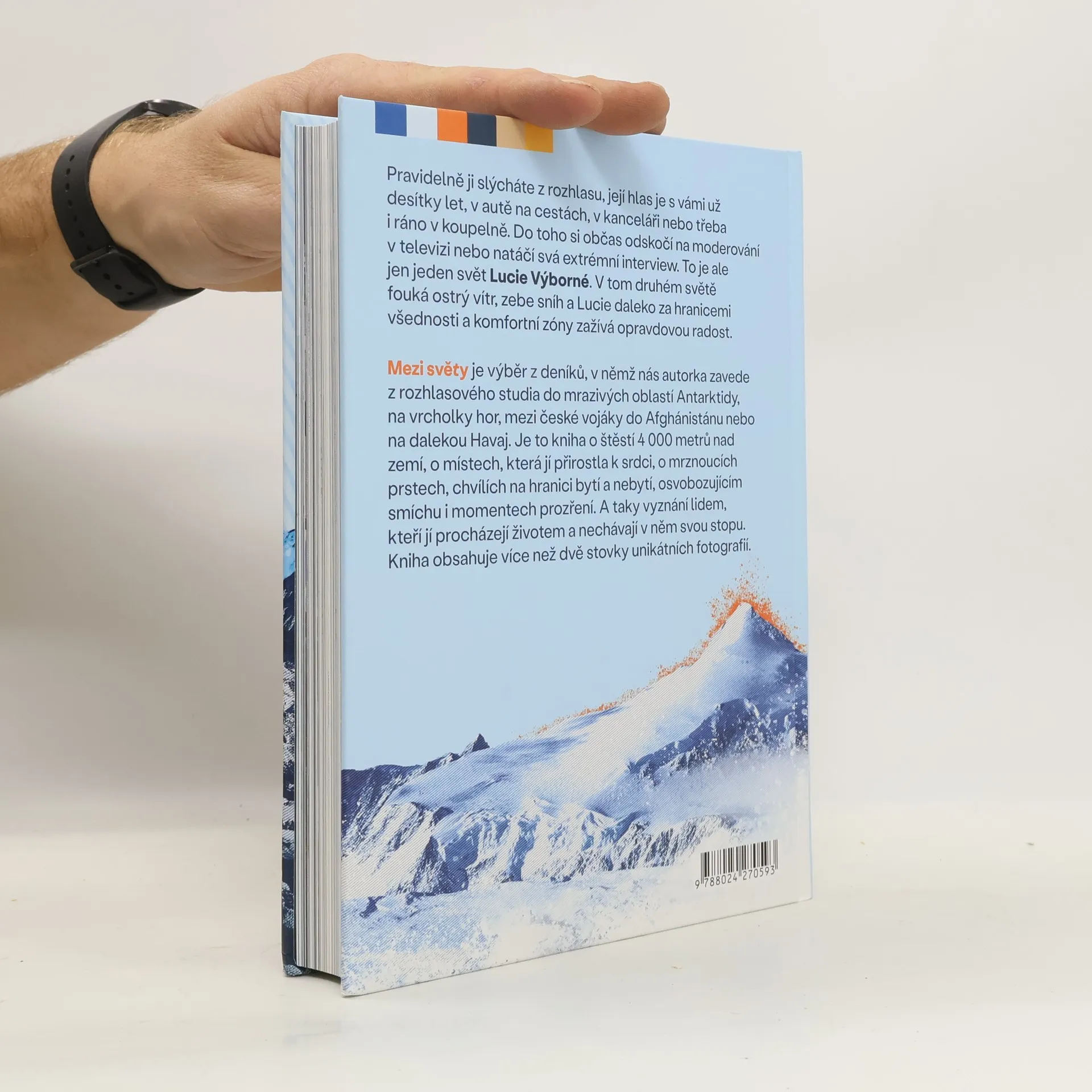 Pravidelně ji slýcháte z rozhlasu, její hlas je s vámi už desítky let, v autě na cestách, v kanceláři nebo třeba i ráno v koupelně. Do toho si občas odskočí na moderování v televizi nebo natáčí svá extrémní interview. To je ale jen jeden svět Lucie Výborné. V tom druhém světě fouká ostrý vítr, zebe sníh a Lucie daleko za hranicemi všednosti a komfortní zóny zažívá opravdovou radost. MEZI SVĚTY je výběr z deníků, v nichž nás autorka zavede z rozhlasového studia do mrazivých oblastí Antarktidy, na vrcholky hor, mezi české vojáky do Afghánistánu nebo na dalekou Havaj. Je to kniha o štěstí 4 000 metrů nad zemí, o místech, která jí přirostla k srdci, o mrznoucích prstech, chvílích na hranici bytí a nebytí, osvobozujícím smíchu i momentech prozření. A taky vyznání lidem, kteří jí procházejí životem a nechávají v něm svou stopu. Kniha obsahuje více než dvě stovky unikátních fotografií.