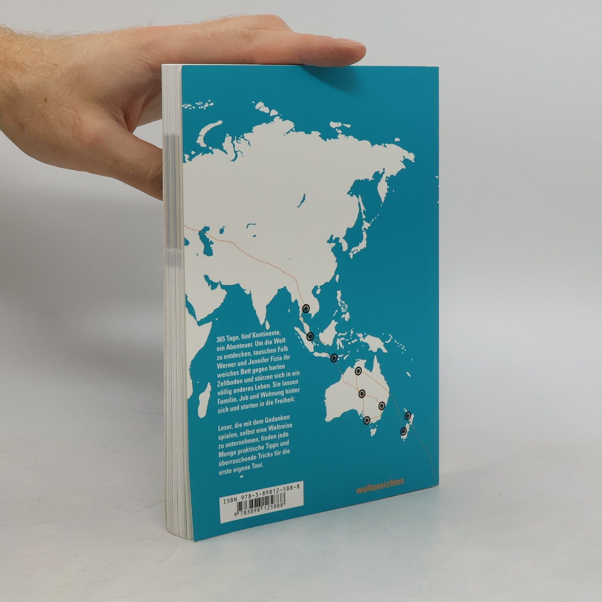 Lohnt sich ein Spanischkurs in Guatemala, wann kann man in die Republik Whangamomona einreisen, was bietet das zweitgrößte Korallenriff der Erde, wo liegt Hobbingen und in welchem Ort kann man einen Cocktail mit mumifiziertem Zeh genießen? 365 Tage, fünf Kontinente, zwei junge Leute, ein Abenteuer. Um die Welt zu entdecken, tauschen Falk Werner und Jennifer Fizia ihr weiches Bett gegen harten Zeltboden und stürzen sich in ein völlig anderes Leben. Sie lassen Familie, Job und Wohnung hinter sich und starten in die Freiheit. Auf ihrer Reise begegnen sie interessanten Menschen, schließen neue Freundschaften – aber auch negative Erlebnisse, wie etwa ein ausgeraubtes Auto, gehören am Ende zur Vielzahl unvergesslicher Eindrücke. Diese witzig-informative Dokumentation einer Erdumrundung gibt tiefe Einblicke in das Leben der Weltreisenden und zeigt so manch überraschende Wandlung. Leser, die mit dem Gedanken spielen, selbst eine Weltreise zu unternehmen, finden jede Menge praktische Tipps und überraschende Tricks für die erste eigene Tour.