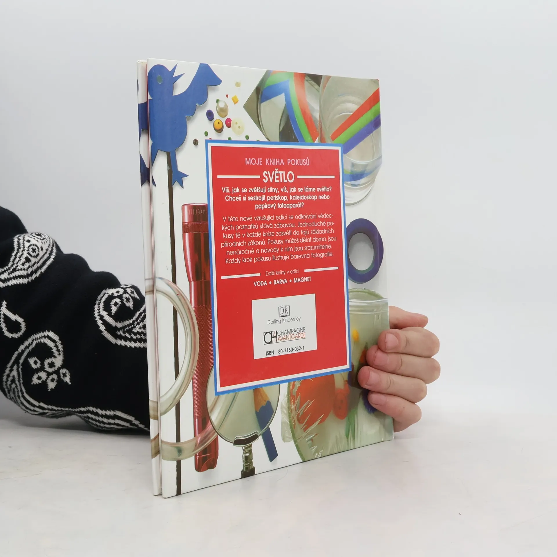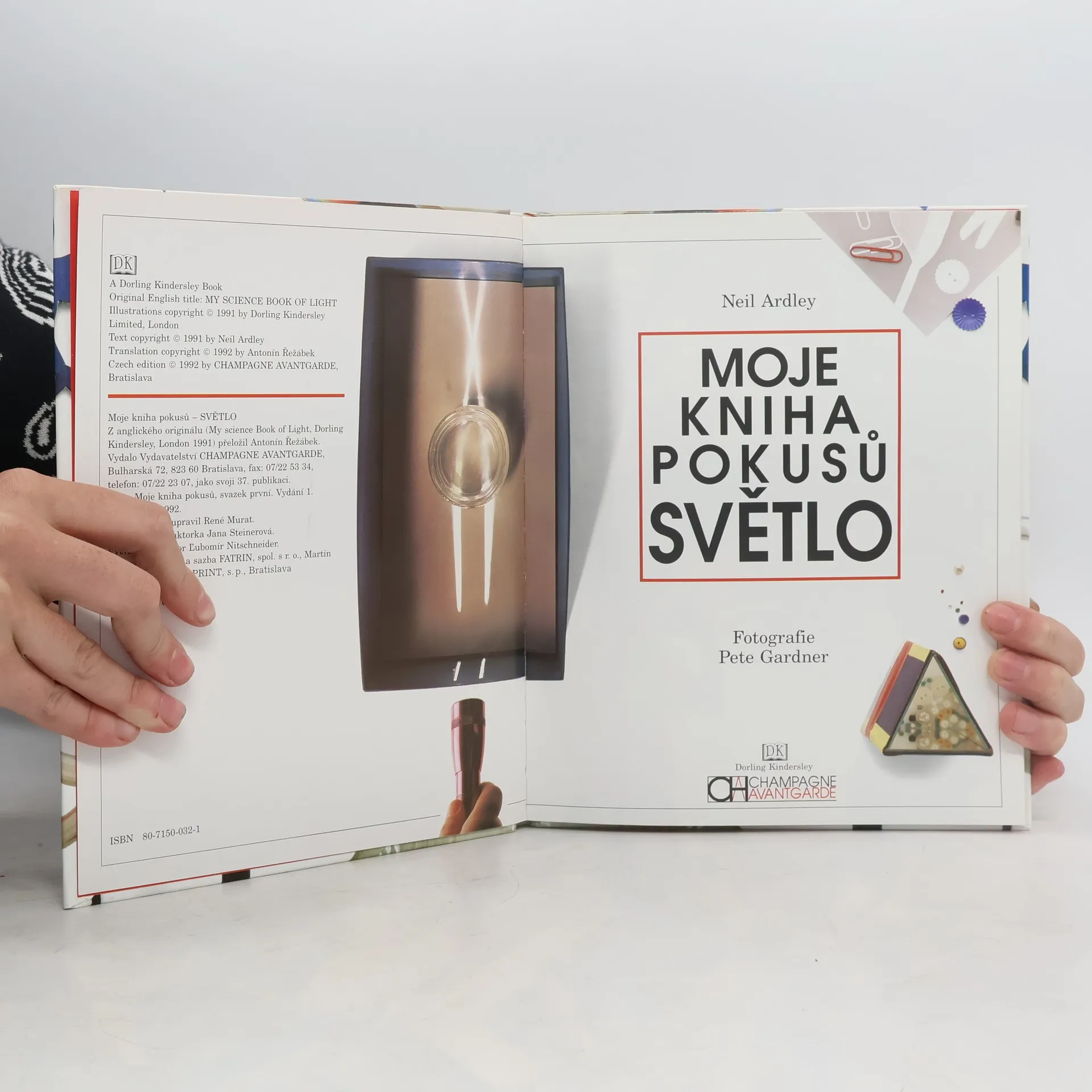 Moje kniha pokusů - SVĚTLO Z anglického originálu My science Book of Light, Dorling Kindersley, London 1991 přeložil Antonín Řežábek. Vydalo Vydavatelství CHAMPAGNE AVANTGARDE, Bulharská 72, 823 60 Bratislava, jako svoji 37. publikaci. Edice Moje kniha pokusů, svazek první. Vydání 1.