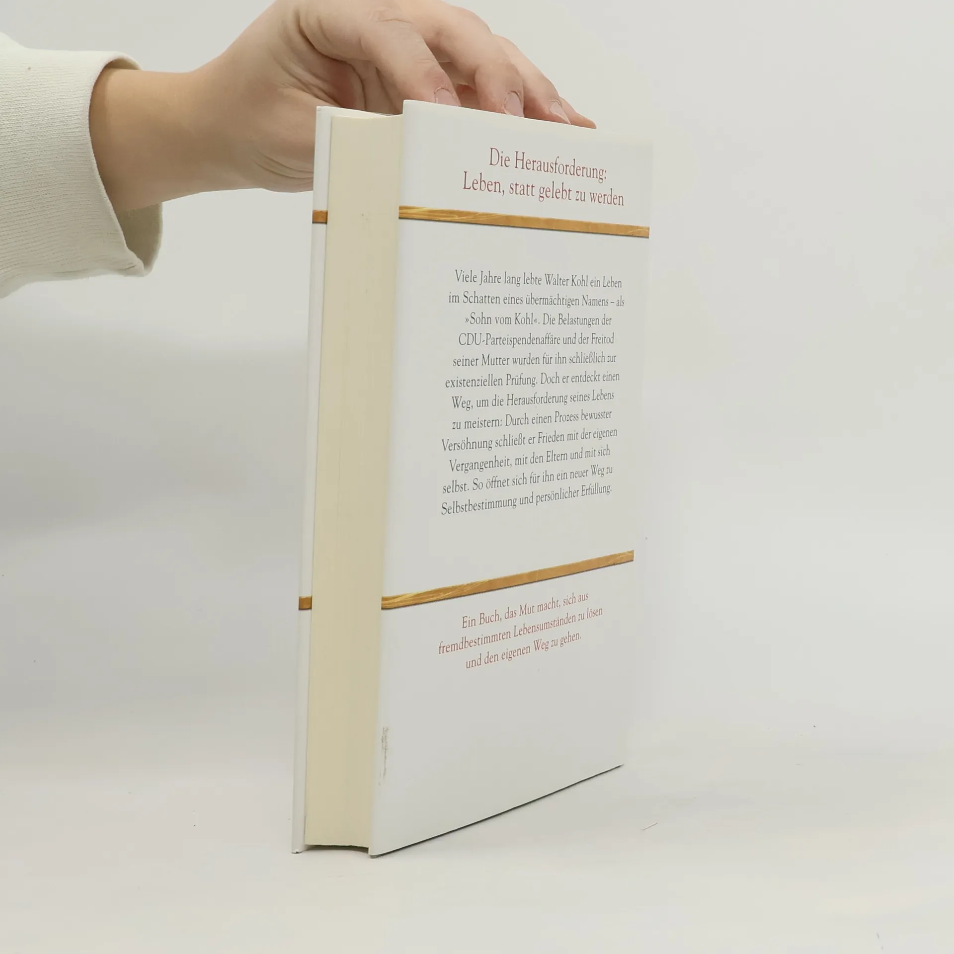 Die Herausforderung: leben, statt gelebt zu werden Viele Jahre lang lebte Walter Kohl ein Leben im Schatten eines übermächtigen Namens – als „Sohn vom Kohl“. Die Belastungen der CDU-Parteispendenaffäre und der Freitod seiner Mutter wurden für ihn schließlich zur existenziellen Prüfung. Doch er entdeckt einen Weg, um die Herausforderung seines Lebens zu meistern: Durch einen Prozess bewusster Versöhnung schließt er Frieden mit der eigenen Vergangenheit, mit den Eltern und mit sich selbst. So öffnet sich für ihn ein neuer Weg zu Selbstbestimmung und persönlicher Erfüllung. Ein Buch, das Mut macht, sich aus fremdbestimmten Lebensumständen zu lösen und den eigenen Weg zu gehen. Ausstattung: 8 Seiten Bildteil