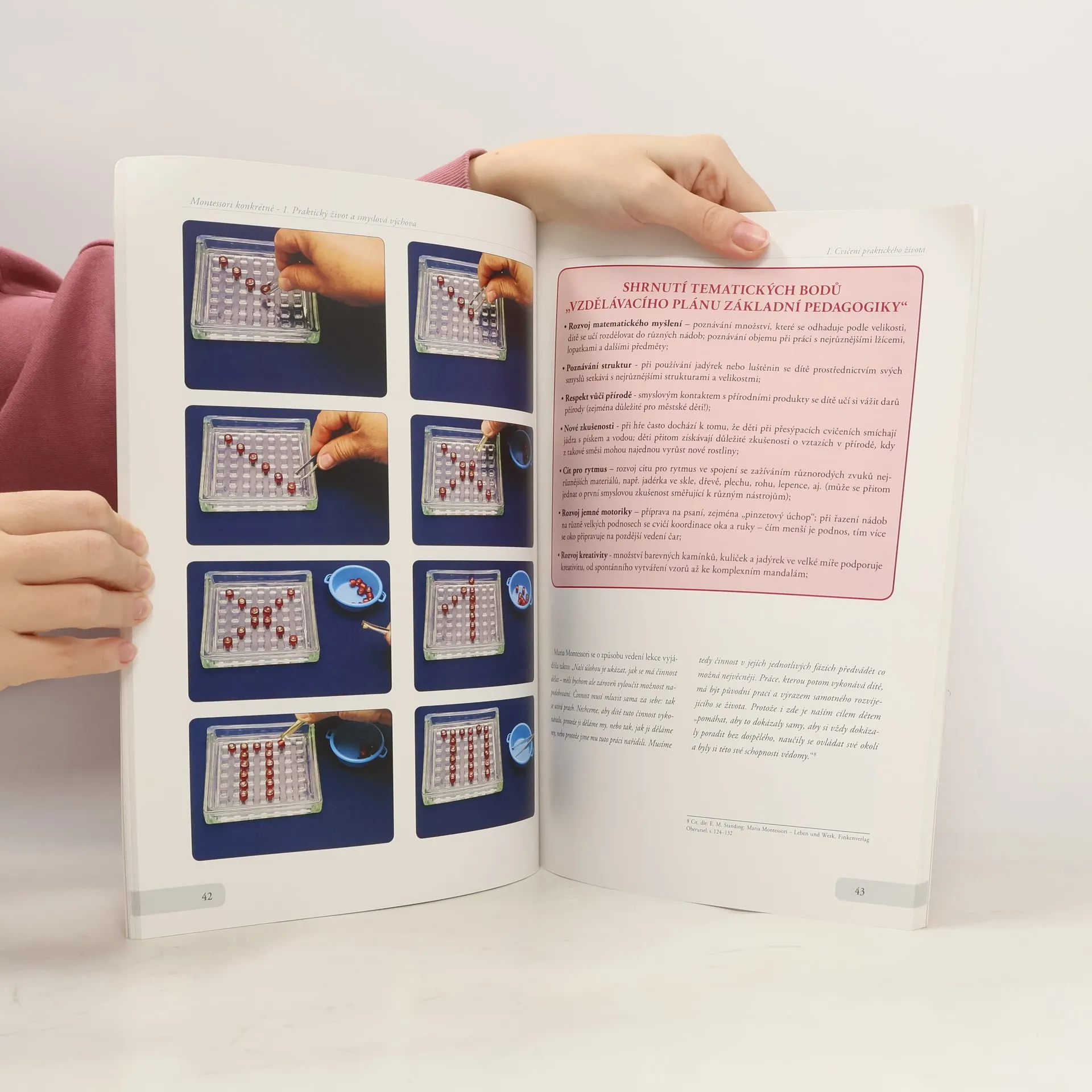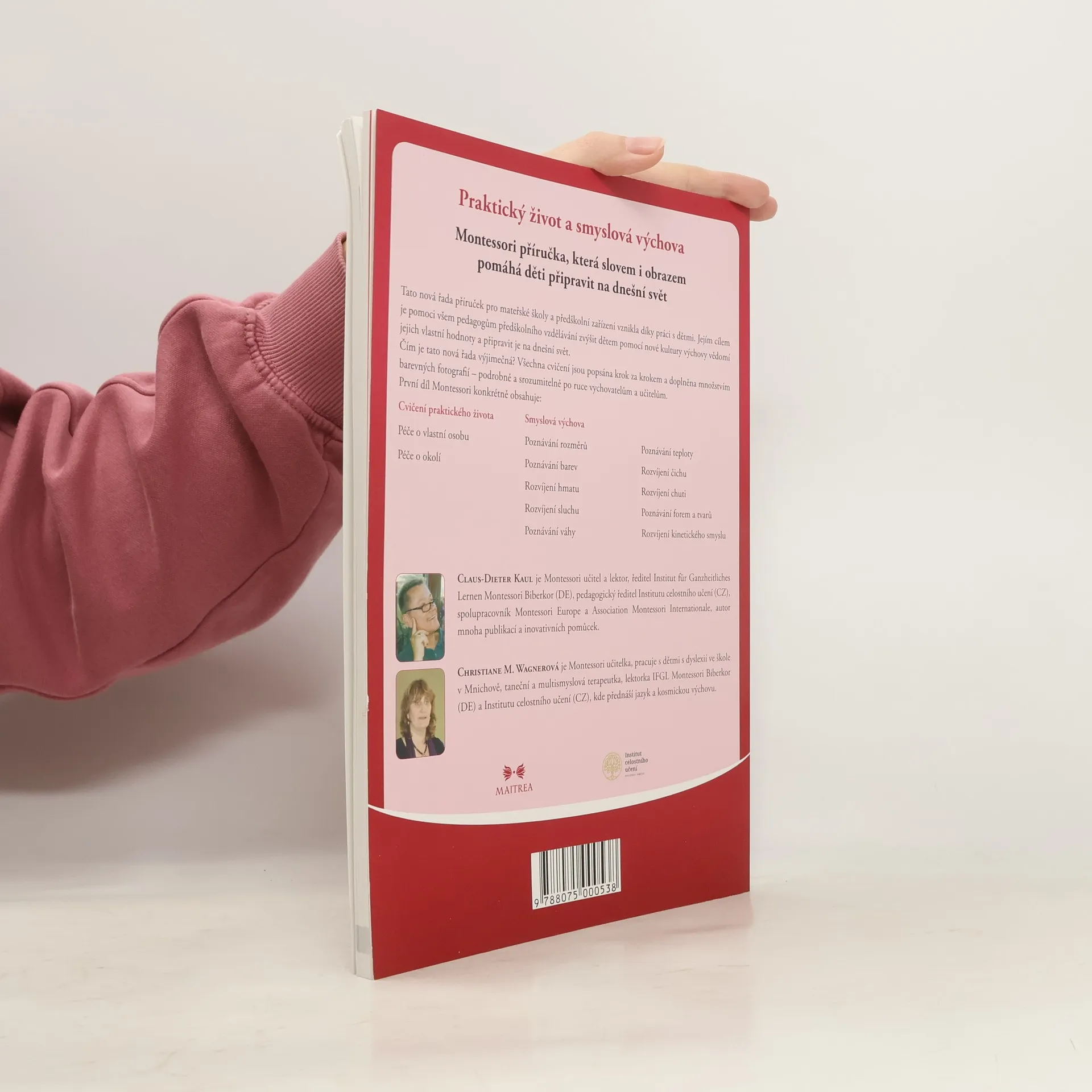Příručka celostního vzdělávání dětí – nápady pro praxi Tato nová řada příruček pro mateřské školy a předškolní zařízení vznikla díky práci s dětmi. Jejím cílem je pomoci všem pedagogům předškolního vzdělávání zvýšit pomocí nové kultury výchovy dětem vědomí jejich vlastní hodnoty a připravit je na dnešní svět. Čím je tato nová řada výjimečná? Všechna cvičení jsou popsána krok za krokem a doplněna množstvím barevných fotografií – podrobně a srozumitelně po ruce vychovatelům a učitelům. První díl Montessori konkrétně obsahuje: Cvičení praktického života - péče o vlastní osobu, péče o okolí, Smyslovou výchovu - poznávání rozměrů, poznávání barev, rozvíjení hmatu, rozvíjení sluchu, poznávání váhy, poznávání teploty, rozvíjení čichu, rozvíjení chuti, poznávání forem a tvarů, rozvíjení kinetického smyslu