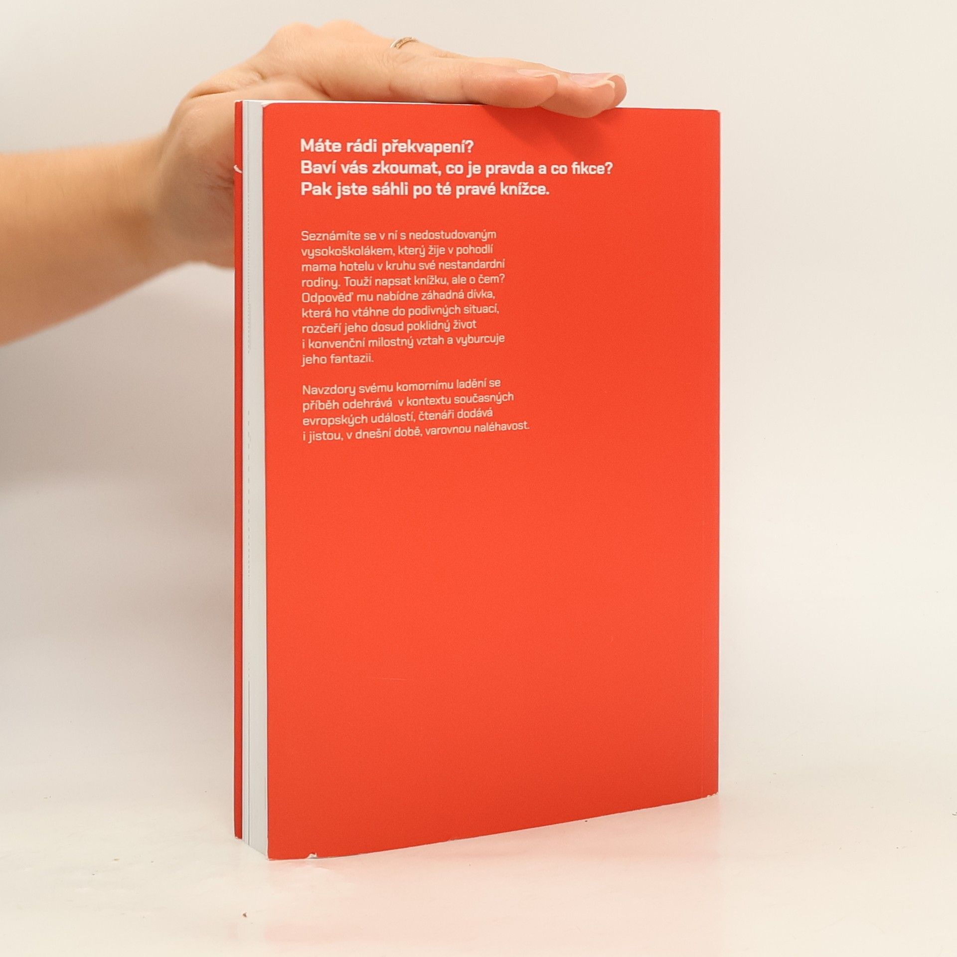 Máte rádi překvapení? Baví vás zkoumat, co je pravda a co fikce? Pak jste sáhli po té pravé knížce. Seznámíte se v ní s nedostudovaným vysokoškolákem, který žije v pohodlí mama hotelu v kruhu své nestandardní rodiny. Touží napsat knížku, ale o čem? Odpověď mu nabídne záhadná dívka, která ho vtáhne do podivných situací, rozčeří jeho dosud poklidný život i konvenční milostný vztah a vyburcuje jeho fantazii. Navzdory svému komornímu ladění se příběh odehrává v kontextu současných evropských událostí, čtenáři dodává i jistou, v dnešní době, varovnou naléhavost.