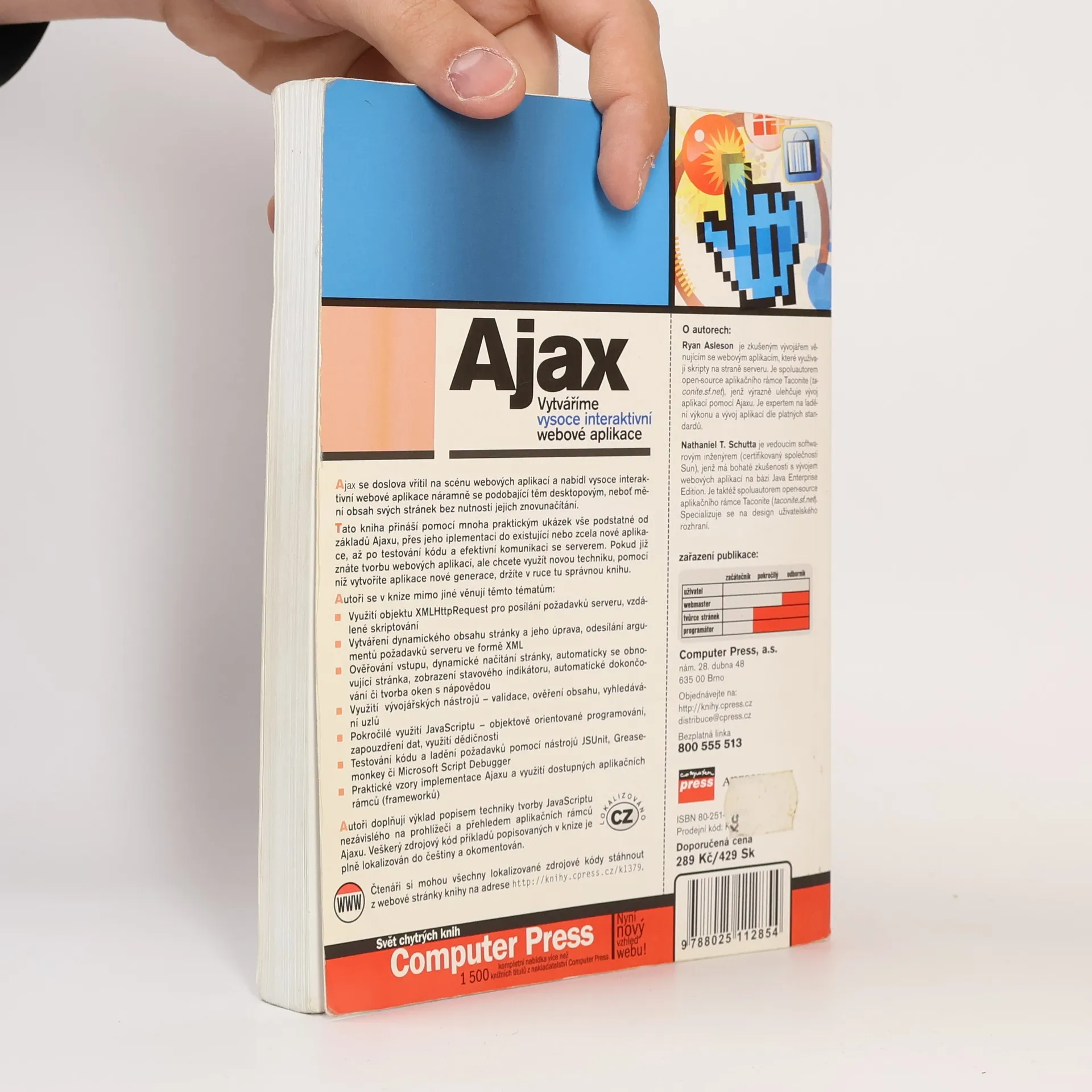 Ajax se vřítil na scénu webových aplikací a přinesl vysoce interaktivní zážitky podobné desktopovým aplikacím, neboť umožňuje měnit obsah stránek bez jejich znovunačítání. Kniha nabízí praktické ukázky od základů Ajaxu, jeho implementaci do stávajících nebo nových aplikací, až po testování kódu a efektivní komunikaci se serverem. Je určena pro ty, kteří již znají tvorbu webových aplikací a chtějí využít tuto novou techniku pro vývoj aplikací nové generace. Autoři se zaměřují na témata jako využití objektu XMLHttpRequest pro posílání požadavků serveru, vytváření a úpravu dynamického obsahu, ověřování vstupu, dynamické načítání stránek, zobrazení stavového indikátoru a automatické dokončování. Dále se věnují vývojářským nástrojům pro validaci a vyhledávání uzlů, pokročilému JavaScriptu včetně objektově orientovaného programování a testování kódu pomocí nástrojů jako JSUnit a Microsoft Script Debugger. Kniha také popisuje techniku tvorby JavaScriptu nezávislého na prohlížeči a přehled aplikačních rámců Ajaxu. Veškerý zdrojový kód příkladů je lokalizován do češtiny a okomentován, což usnadňuje porozumění a aplikaci naučeného.