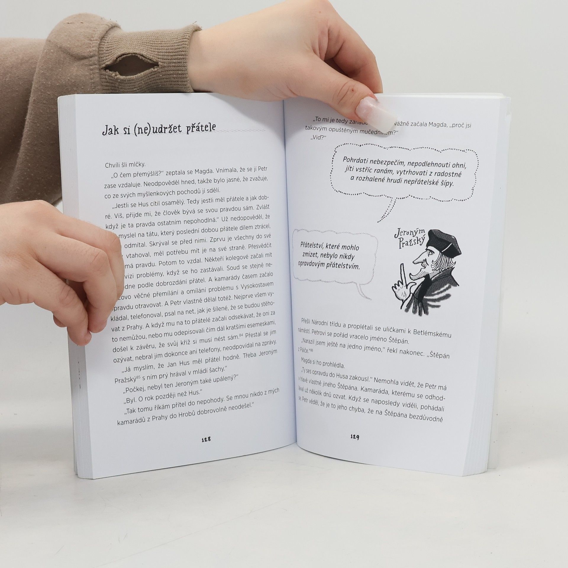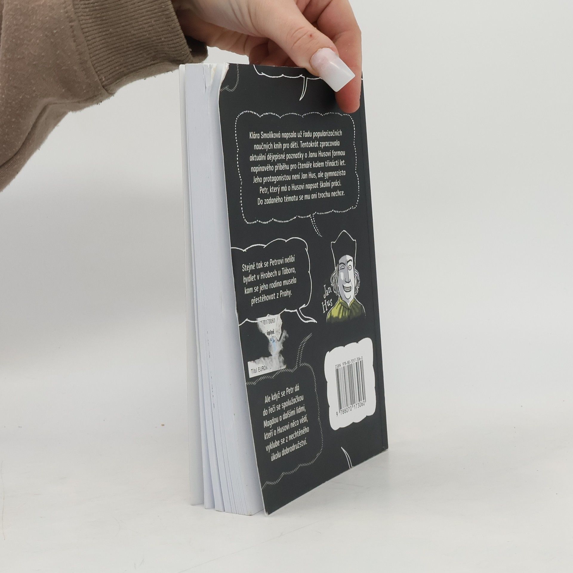 Zkušená autorka popularizačních naučných knih pro děti Klára Smolíková zpracovala aktuální dějepisné poznatky o Janu Husovi formou napínavého příběhu, určeného čtenářům kolem třinácti let. Jeho protagonistou není Jan Hus, ale gymnazista Petr, který má o Husovi napsat školní práci. Do zadaného tématu se mu ani trochu nechce – stejně jako vůbec nechce bydlet v Hrobech u Tábora, kam se jeho rodina ze dne na den přestěhovala z Prahy. Ale když se dá do řeči se spolužačkou Magdou a s dalšími lidmi, kteří o Husovi něco vědí, vyklube se z nechtěného úkolu dobrodružná cesta. Historická postava vytesaná do kamene před Petrem postupně ožívá stejně jako Husovi současníci, jeho doba, různá působiště i myšlenky, kterými ovlivnil pozdější české myslitele, umělce, učence i politiky. Každý si z Husa vzal něco jiného a každá doba si ho přizpůsobovala ke svému obrazu. Také Petr hledá a nalézá ty stránky jeho osobnosti, které jsou blízké jemu a mají co říct i jeho tátovi, který se jako odvážný novinář ocitl v úzkých. Příběh nápaditě dokreslují ilustrace Lukáše Fibricha i parafráze skutečných výroků historických postav. Pro hloubavější čtenáře doplnil odborný poradce publikace Richard Vlasák na závěr knihy vysvětlivky, které objasňují historické souvislosti, přibližují odlišné směry křesťanství a uvádějí spolehlivé původní zdroje pro současné poznání Husova života a díla, z nichž příběh vychází.