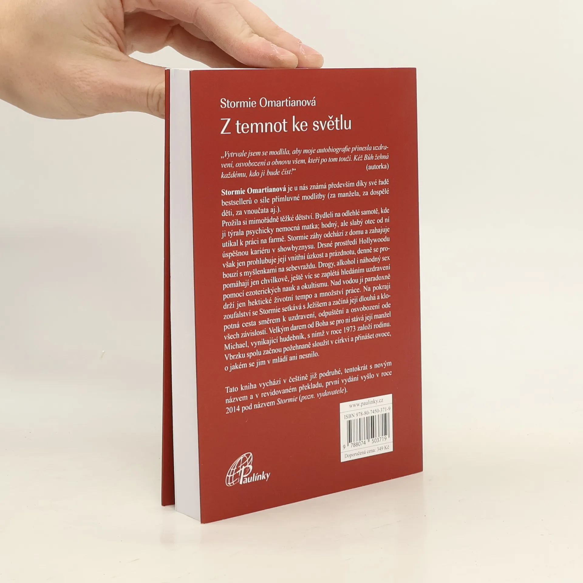 Stormie Omartianová je u nás známá především díky své řadě bestsellerů o síle přímluvné modlitby (za manžela, za dospělé děti, za vnoučata aj.). Prožila si mimořádně těžké dětství. Bydleli na odlehlé samotě, kde ji týrala psychicky nemocná matka; hodný, ale slabý otec od ní utíkal k práci na farmě. Stormie záhy odchází z domu a zahajuje úspěšnou kariéru v showbyznysu. Drsné prostředí Hollywoodu však jen prohlubuje její vnitřní úzkost a prázdnotu, denně se probouzí s myšlenkami na sebevraždu. Drogy, alkohol i náhodný sex pomáhají jen chvilkově, ještě víc se zaplétá hledáním uzdravení pomocí ezoterických nauk a okultismu. Nad vodou ji paradoxně drží jen hektické životní tempo a množství práce. Na pokraji zoufal ství se Stormie setkává s Ježíšem a začíná její dlouhá a klopotná cesta směrem k uzdravení, odpuštění a osvobození ode všech závislostí. Velkým darem od Boha se pro ni stává její manžel Michael, vynikající hudebník, s nímž v roce 1973 založí rodinu. Vbrzku spolu začnou požehnaně sloužit v církvi a přinášet ovoce, o jakém se jim v mládí ani nesnilo. Tato kniha vychází v češtině již podruhé, tentokrát s novým názvem a v revidovaném překladu, první vydání vyšlo v roce 2014 pod názvem Stormie.