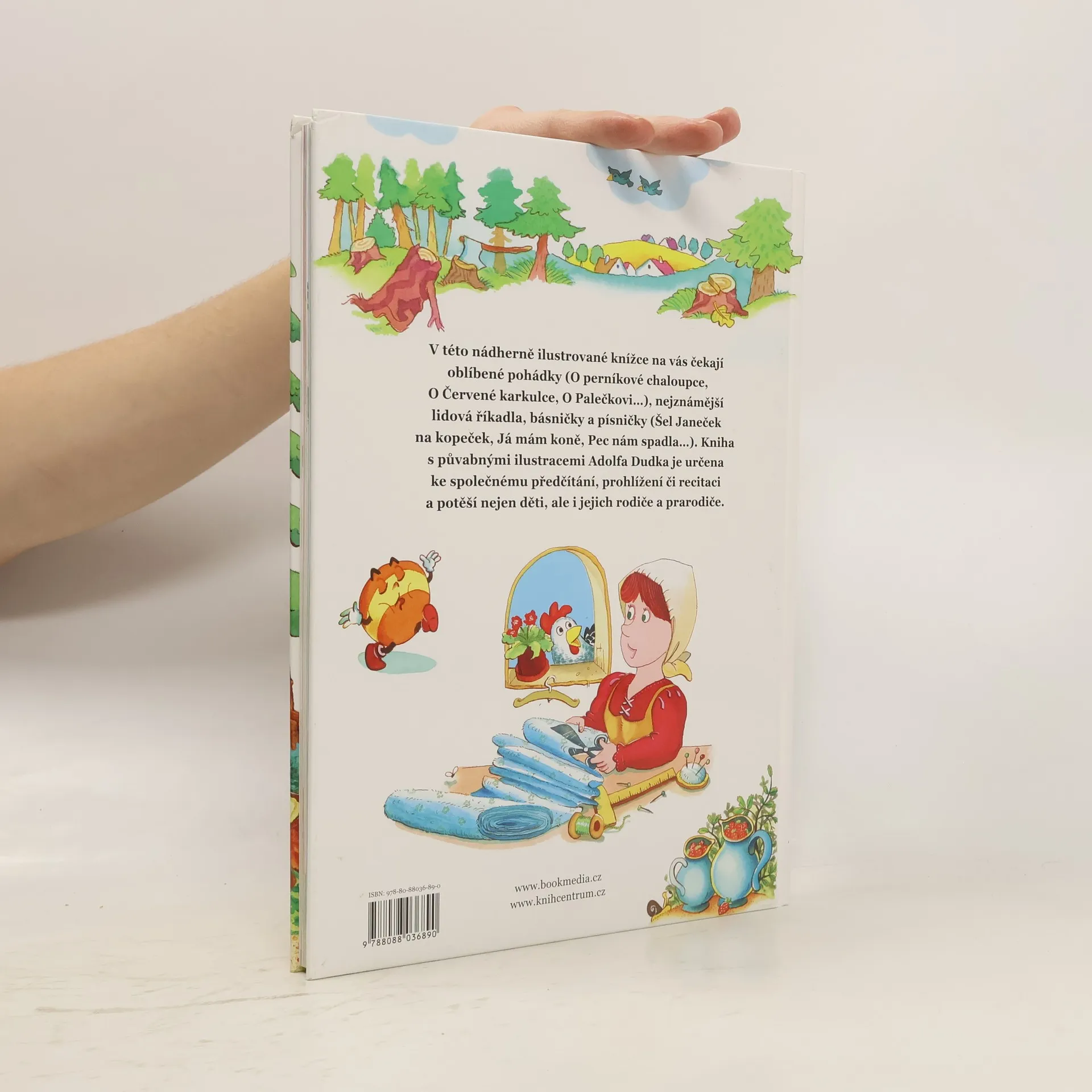 V této nádherně ilustrované knížce na vás čekají oblíbené pohádky (O perníkové chaloupce, O Ćervené karkulce, O Palečkovi…), nejznámější lidová říkadla, básničky a písničky (Šel Janeček na kopeček, Já mám koně, Pec nám spadla…), Kniha s půvabnými ilustracemi Adolfa Dudka je určena ke společnému předčítání, prohlížení či recitaci a potěší nejen děti, ale i jejich rodiče a prarodiče.