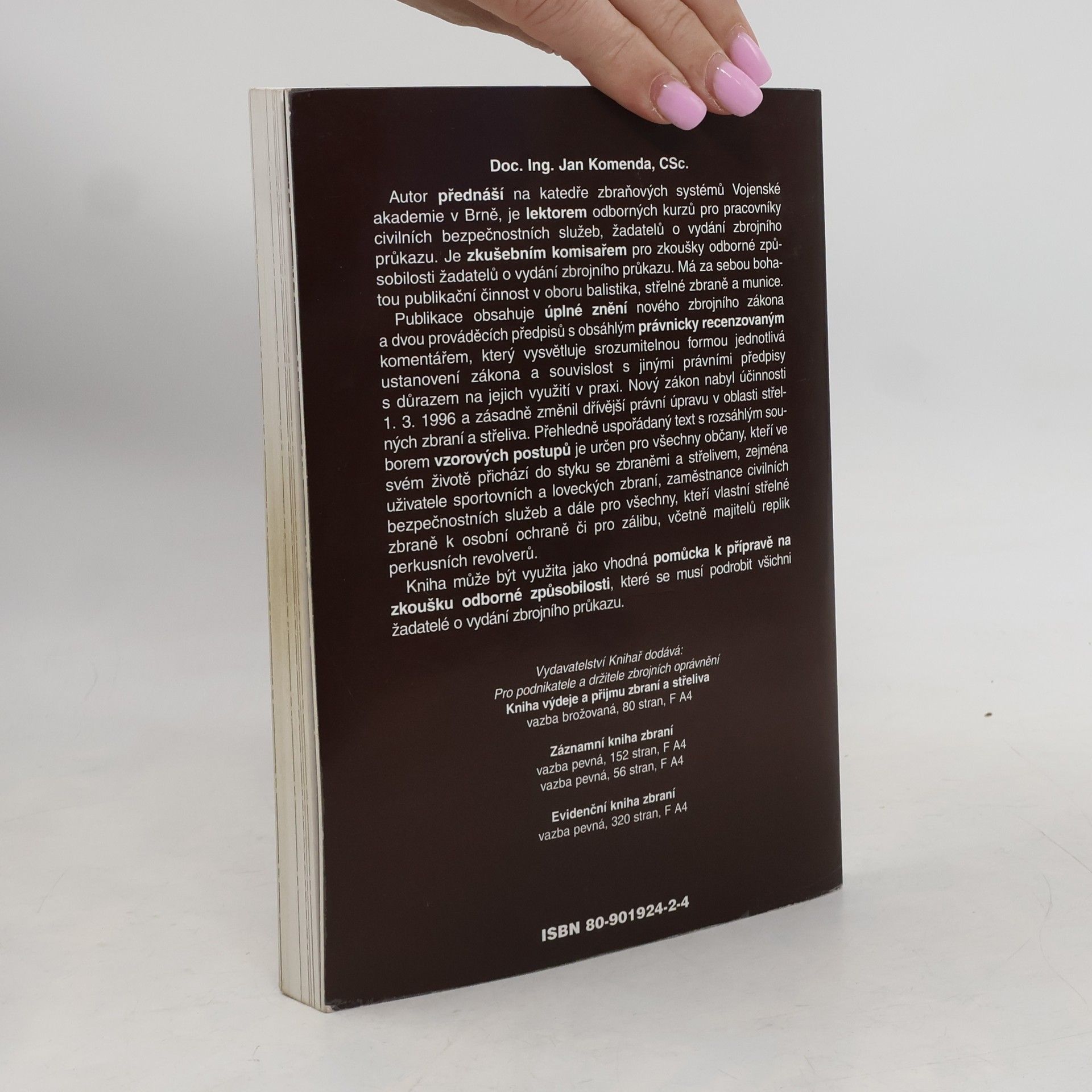 Kniha je nejen zněním samotného zákona, ale též fundovaným komentářem jeho jednotlivých paragrafů, kladoucím důraz na jejich aplikaci v praxi. Vysvětluje problematiku právní regulace držení a nošení střelných zbraní v našem právním systému. Je určena pro uživatele, kteří se zbraněmipřicházejí do kontaktu v rámci svých civilních aktivit a je vhodnou příručkou pro žadatele o zbrojní pas.