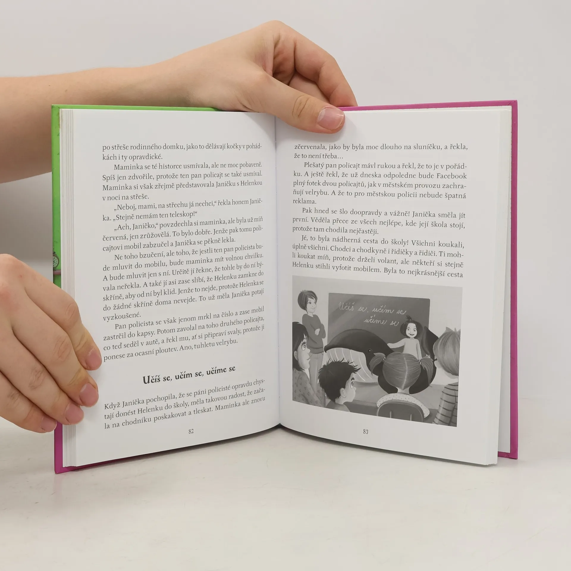 Co se stane, když se v úplně normální rodině ocitne velryba? Janička chodí do druhé třídy a ví si rady skoro se vším. Jednoho dne se stane fůra divných věcí, a tou nejpodivnější je to, že dostane velrybu. Jmenuje se Helenka a je větší než maminka s tatínkem dohromady. Co na její novou kamarádku řeknou rodiče? A hlavně, co tomu řeknou lidi? Janička nejprve neví, co si s velrybou počne. Ale protože má za ušima, vymyslí chytrý plán. Chcete vědět jaký? Tak se pusťte do čtení!
