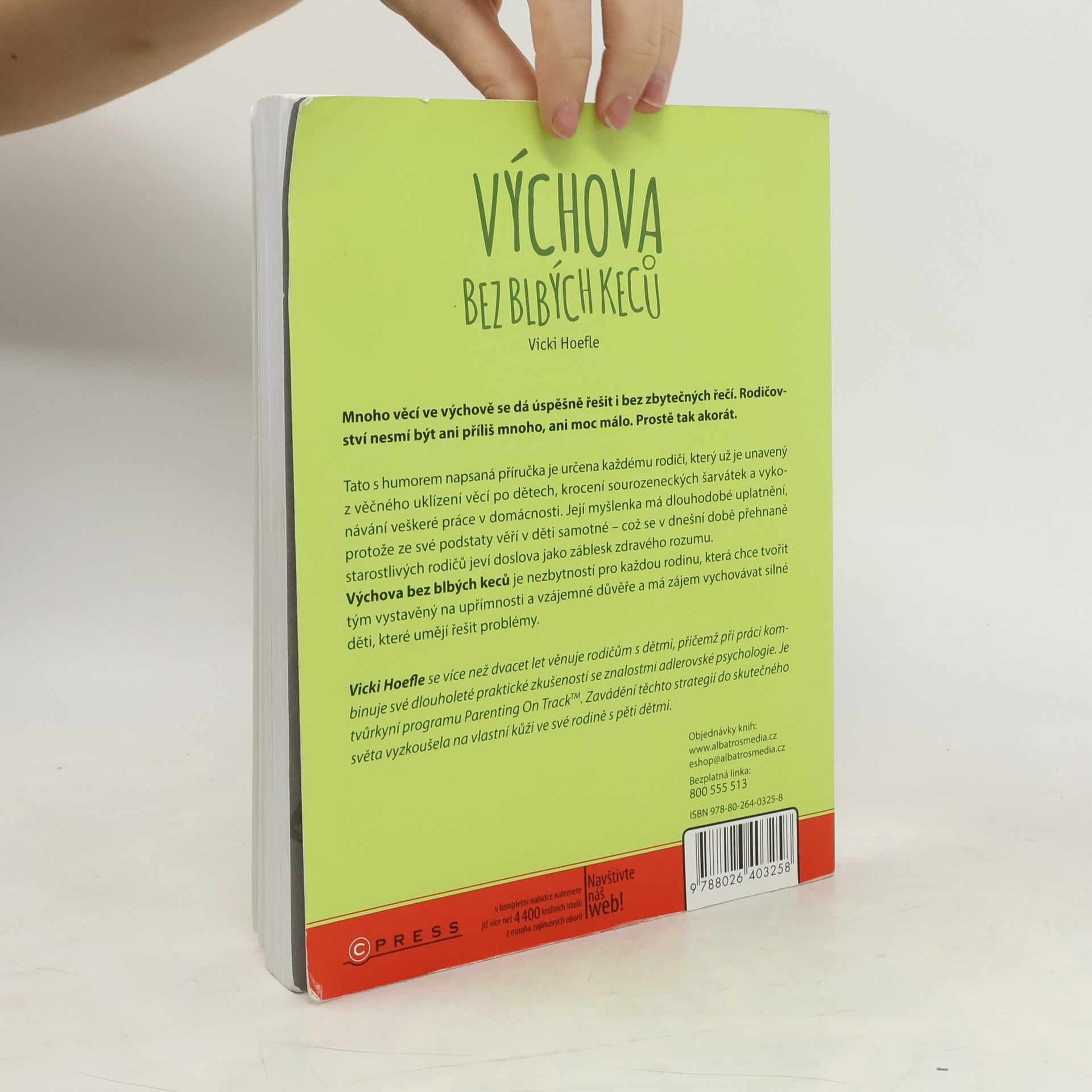 Mnoho věcí ve výchově se dá úspěšně řešit i bez zbytečných řečí. Rodičovství nesmí být ani příliš mnoho, ani moc málo. Prostě tak akorát. Tato s humorem napsaná příručka je určena každému rodiči, který už je unavený z věčného uklízení věcí po dětech, krocení sourozeneckých šarvátek a vykonávání veškeré práce v domácnosti. Její myšlenka má dlouhodobé uplatnění, protože ze své podstaty věří v děti samotné – což se v dnešní době přehnaně starostlivých rodičů jeví doslova jako záblesk zdravého rozumu. Výchova bez blbých keců je nezbytností pro každou rodinu, která chce tvořit tým vystavěný na upřímnosti a vzájemné důvěře a má zájem vychovávat silné děti, které umějí řešit problémy. Vicki Hoefle se více než dvacet let věnuje rodičům s dětmi, přičemž při práci kombinuje své dlouholeté praktické zkušenosti se znalostmi adlerovské psychologie. Je tvůrkyní programu Parenting On TrackTM. Zavádění těchto strategií do skutečného světa vyzkoušela na vlastní kůži ve své rodině s pěti dětmi.