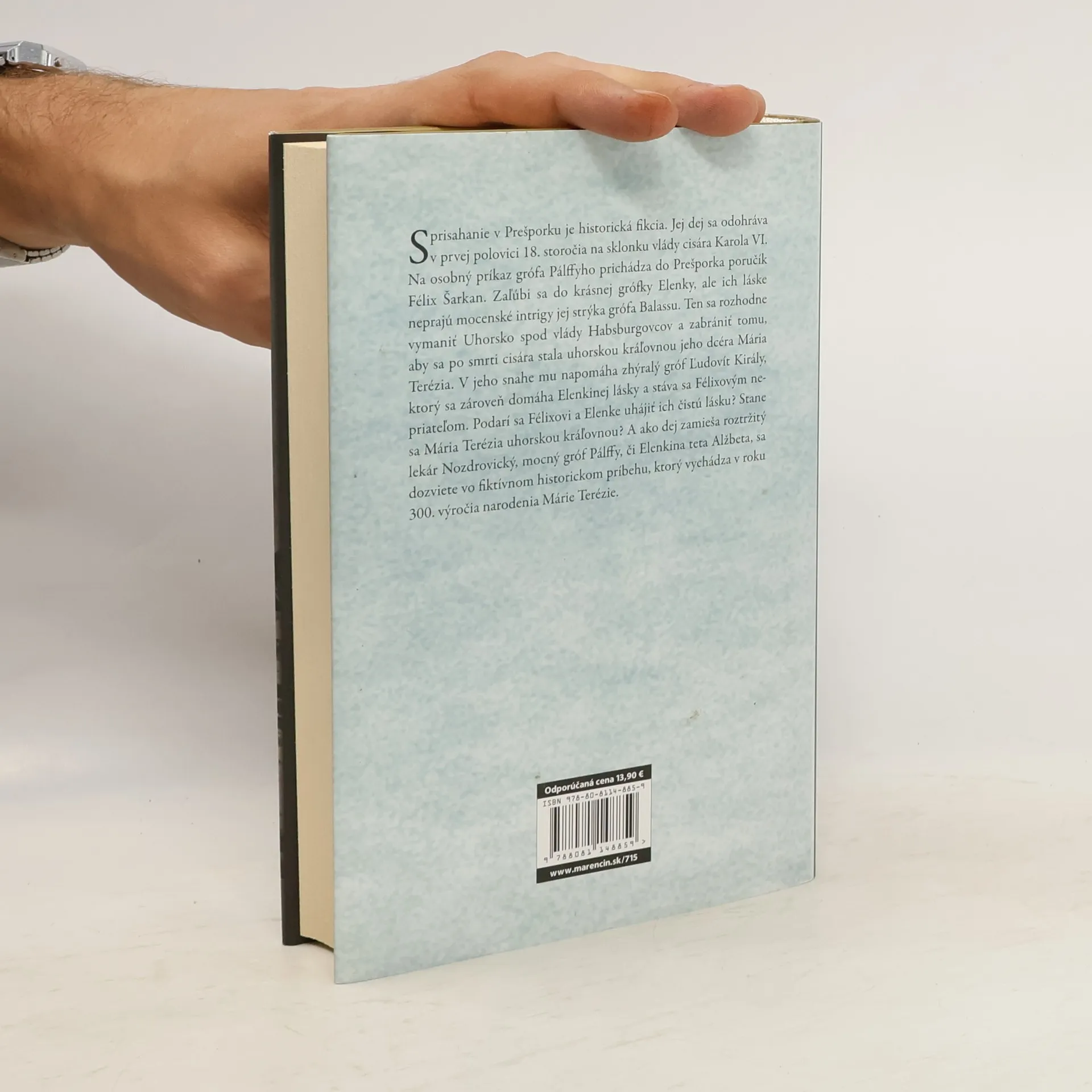 Sprisahanie v Prešporku je historická fikcia. Jej dej sa odohráva v prvej polovici 18. storočia na sklonku vlády cisára Karola VI. Na osobný príkaz grófa Pálffyho prichádza do Prešporka poručík Félix Šarkan. Zaľúbi sa do krásnej grófky Elenky, ale ich láske neprajú mocenské intrigy jej strýka grófa Balassu. Ten sa rozhodne vymaniť Uhorsko spod vlády Habsburgovcov a zabrániť tomu, aby sa po smrti cisára stala uhorskou kráľovnou jeho dcéra Mária Terézia. V jeho snahe mu napomáha zhýralý gróf Ľudovít Király, ktorý sa zároveň domáha Elenkinej lásky a stáva sa Félixovým nepriateľom. Podarí sa Félixovi a Elenke uhájiť ich čistú lásku? Stane sa Mária Terézia uhorskou kráľovnou? A ako dej zamieša roztržitý lekár Nozdrovický, mocný gróf Pálffy, či Elenkina teta Alžbeta, sa dozviete vo fiktívnom historickom príbehu, ktorý vychádza v roku 300. výročia narodenia Márie Terézie.
