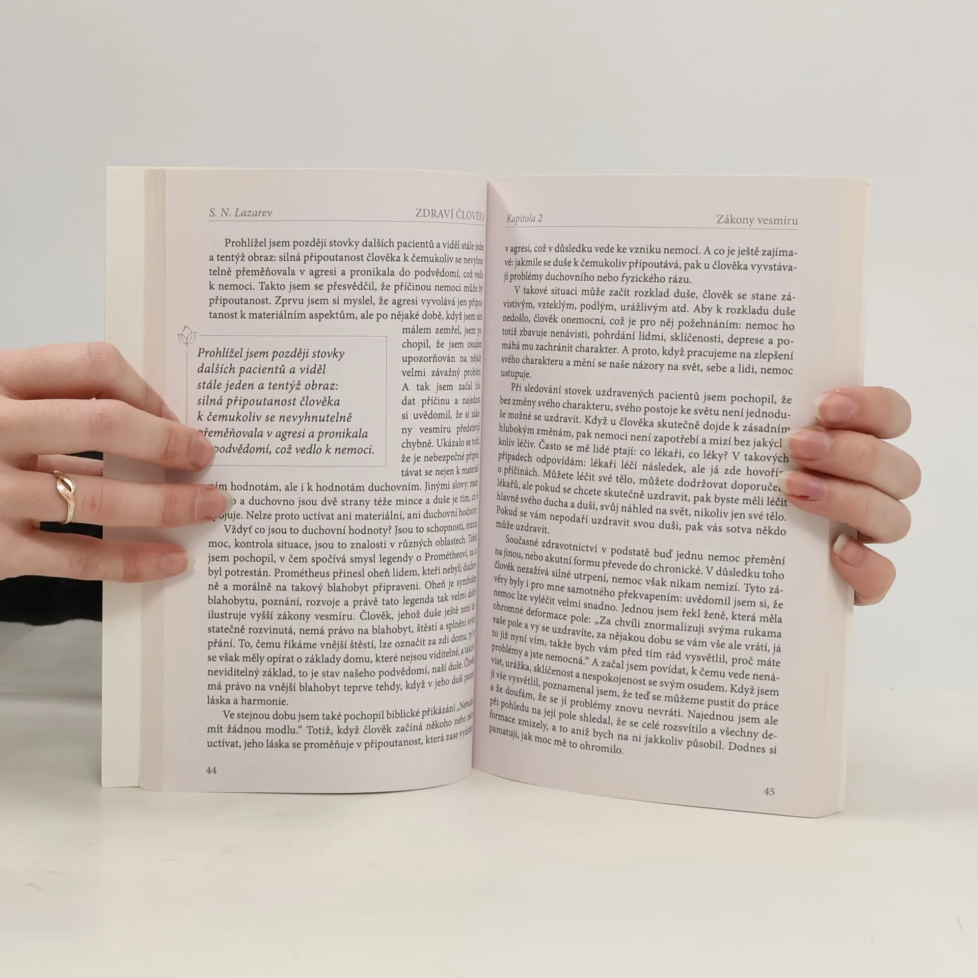 Hlavním cílem mnoha lidí, kteří čtou knihy S.N. Lazareva a přicházejí na jeho semináře, je vyřešit některé ze svých problémů. Mnohdy jsou to totiž právě vážné nemoci a problémy, které je přivádějí ke snaze o pochopení toho, co je to život, k otázkám, v čem spočívá jeho smysl, zda existuje souvislost mezi minulostí a budoucností, zda platí takový pojem jako karma, jaké dopady mají lidské neřesti či jak své neřesti odčinit. Ne všichni lidé se ale dokáži zorientovat v tak obrovském množství informací, které k nám přicházejí ze všech stran. Současné zdravotnictví v podstatě funguje tak, že nemoc buď přemění na jinou, nebo její akutní formu převede do chronické. V důsledku toho člověk sice nezažívá silné utrpení, ale nemoc nikam nezmizí. Sergej Nikolajevič Lazarev objevil, že vyléčit se je možné skrze pochopení. Když člověk porozumí zákonům bytí a uvědomí si, co je skutečně dobré a co špatné, pak nemoc zmizí sama od sebe. Pochopení léči lépe než léky. Vesmírné zákony a principy, jejichž znalost opravdové pochopení, jsou popsány v této knize.