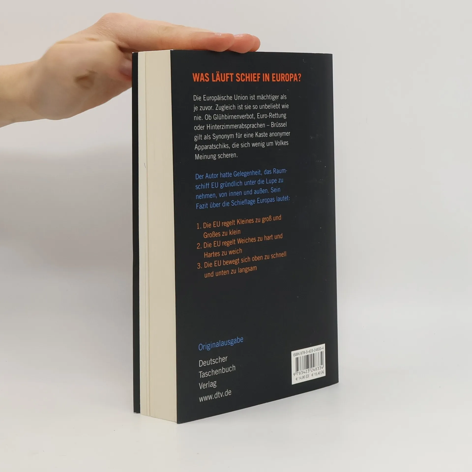 Für viele Europäer ist die EU eine Art Raumschiff, ziemlich abgehoben, schwer durchschaubar, und gegebenfalls lästig, wenn es sich mal wieder herabsenkt und merkwürdige Signale in Form von neuen Regelungen sendet, z. B. einem Glühbirnenverbot. Wenn in Deutschland das öffentlich-rechtliche Fernsehen seiner Pflicht zur Berichterstattung nachkommt, zappen die Zuschauer weg. Denn langweilig ist es auch. Alles ist auf Konsens ausgerichtet, es gibt keinen richtigen Krawall, für vermeintliche Skandale gibt es keinen Verantwortlichen, es gibt keine Tragödien und Komödien. Brüssel, inzwischen das Synonym für Europa, lässt sich leicht gleichsetzen mit einer Kaste anonymer Apparatschiks. Nicht mal der Volkszorn findet ein Zielobjekt. Das ist nicht herzerwärmend. Warum wächst und gedeiht das Image-Problem der EU? Der Autor hatte Gelegenheit, dieses Raumschiff gründlich unter die Lupe zu nehmen, von innen und außen, und legt hier eine Bestandsaufnahme vor. Was schief läuft in Europa, hat er ordentlich sortiert: 1. Die EU regelt Kleines zu groß und Großes zu klein. 2. Die EU regelt Weiches zu hart und Hartes zu weich. 3. Die EU bewegt sich oben zu schnell und unten zu langsam.