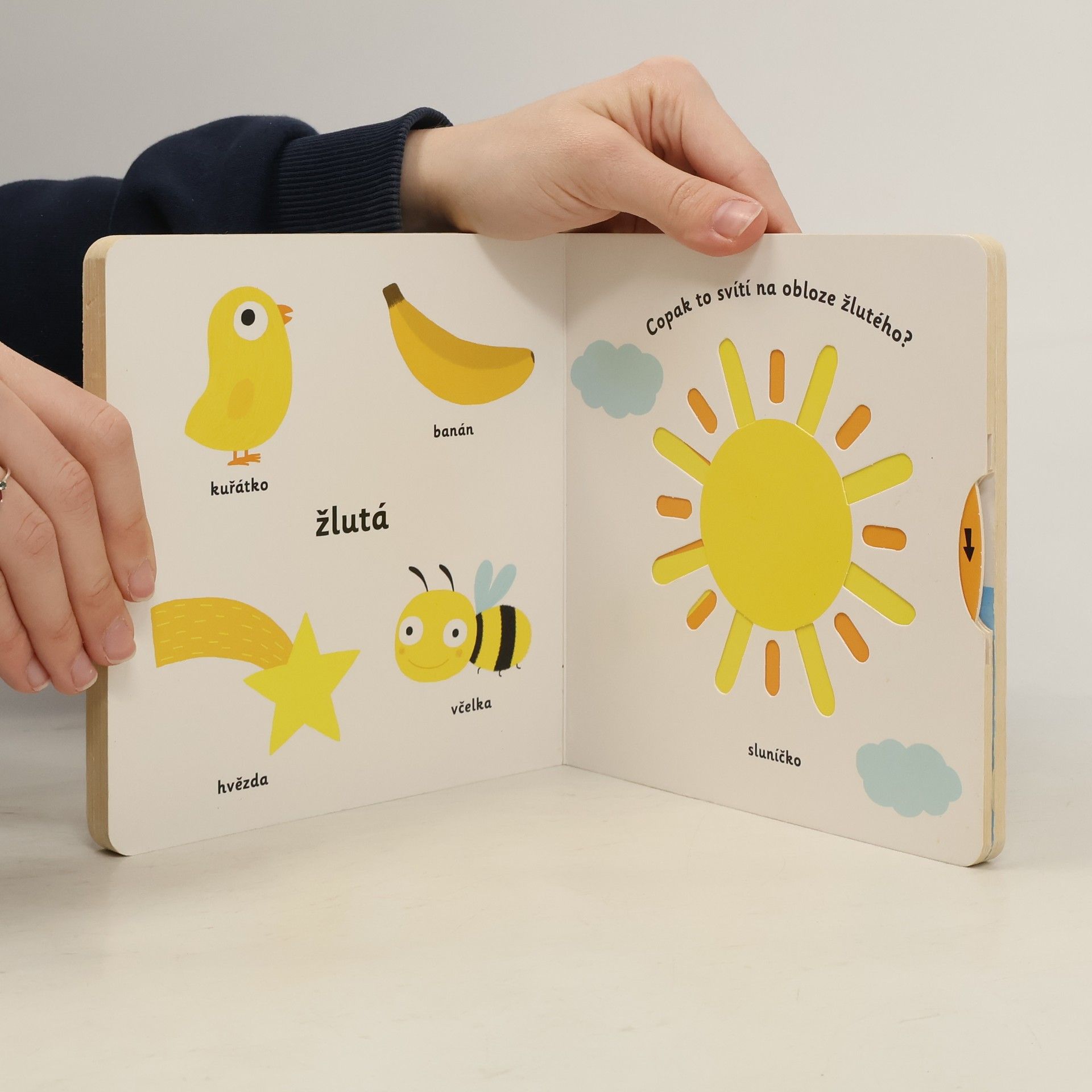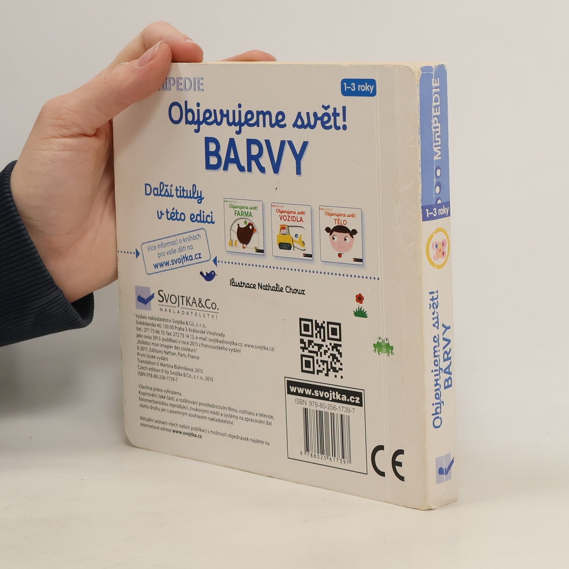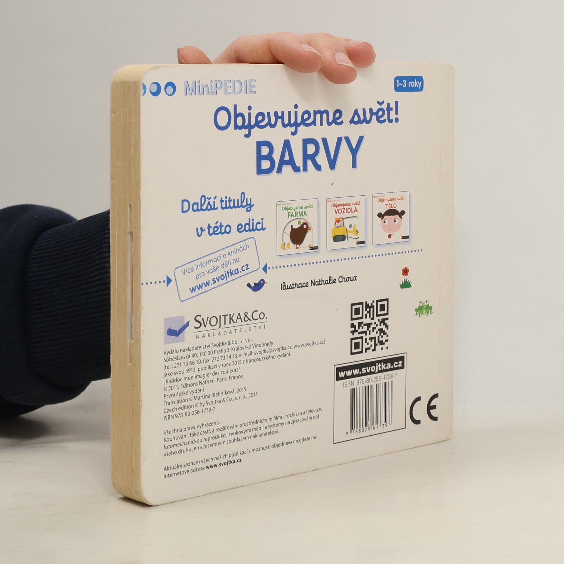 Objevovat svět barev s tímto leporelem je tak zábavné! Jak se jmenuje toto červené ovoce? Co je to za obrovské modré zvíře? Copak to svítí na obloze žlutého? Jak se jmenuje toto zelené zvířátko? Stačí jen vložit prstík do správného otvoru a lehce vysunout, zatáhnout nebo otočit ve směru šipky a hned bude váš malý objevitel znát odpovědi. Leporelo je určeno pro nejmenší děti od jednoho roku a má pevné stránky s posuvnými a otočnými prvky, a tak si naši nejmenší mohou při prohlížení a učení základních barev procvičit i jemnou motoriku.