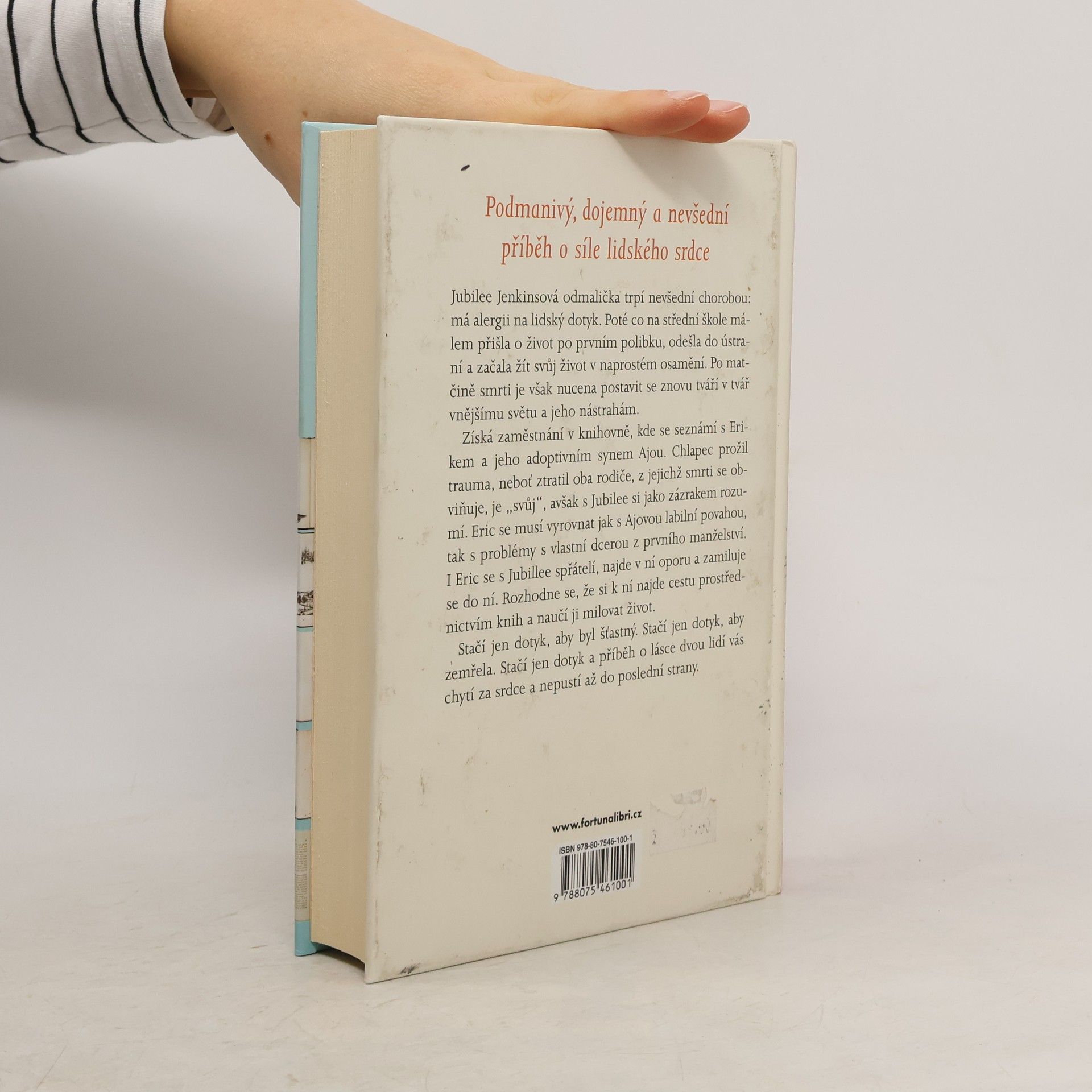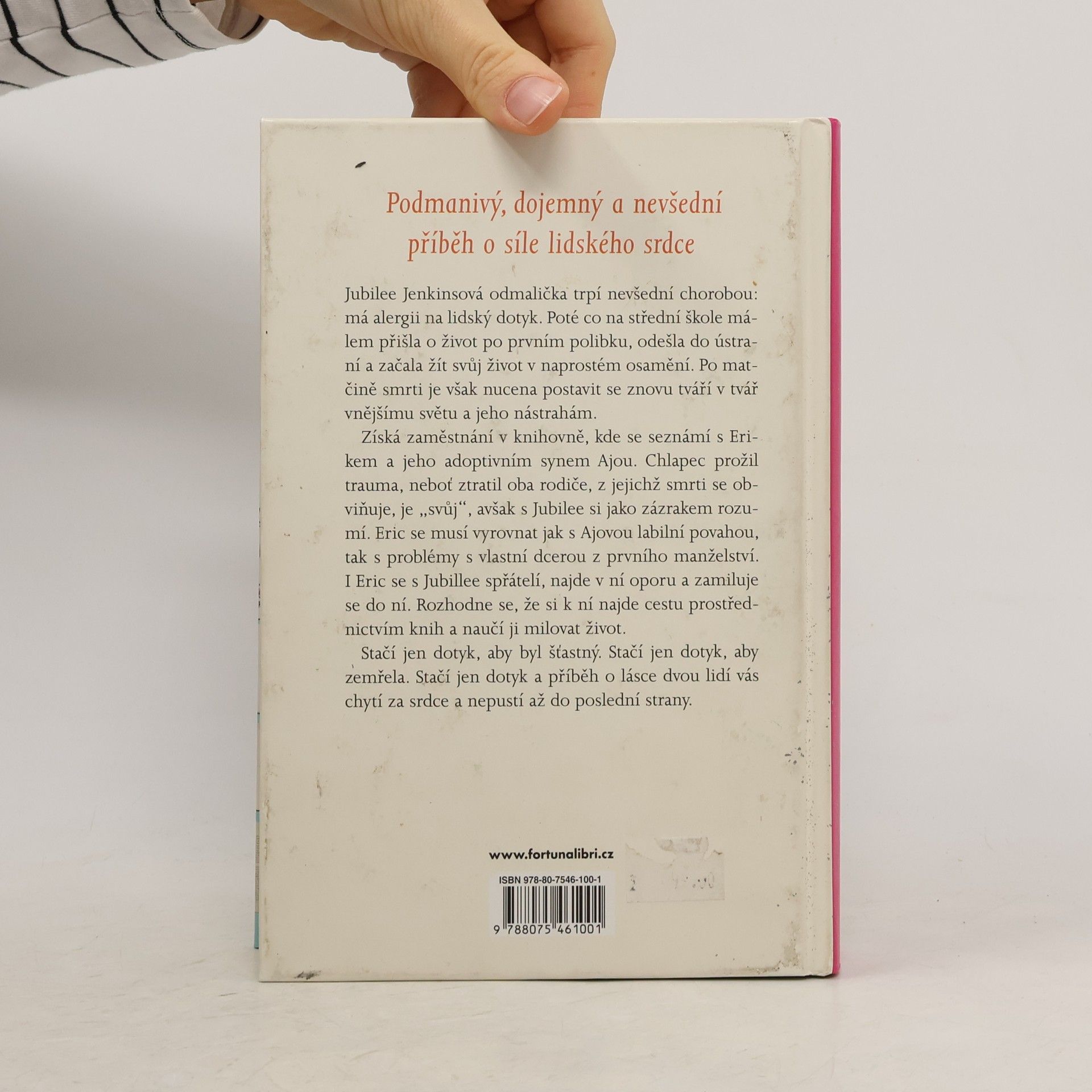 Jubilee Jenkinsová odmalička trpí nevšední chorobou: má alergii na lidský dotyk. Poté co na střední škole málem přišla o život po prvním polibku, odešla do ústraní a začala žít svůj život v naprostém osamění. Po matčině smrti je však nucena postavit se znovu tváří v tvář vnějšímu světu a jeho nástrahám. Získá zaměstnání v knihovně, kde se seznámí s Erikem a jeho adoptivním synem Ajou. Chlapec prožil trauma, neboť ztratil oba rodiče, z jejichž smrti se obviňuje, je „svůj“, avšak s Jubilee si jako zázrakem rozumí. Eric se musí vyrovnat jak s Ajovou labilní povahou, tak s problémy s vlastní dcerou z prvního manželství. I Eric se s Jubillee spřátelí, najde v ní oporu a zamiluje se do ní. Rozhodne se, že si k ní najde cestu prostřednictvím knih a naučí ji milovat život. Stačí jen dotyk, aby byl šťastný. Stačí jen dotyk, aby zemřela. Stačí jen dotyk a příběh o lásce dvou lidí vás chytí za srdce a nepustí až do poslední strany.