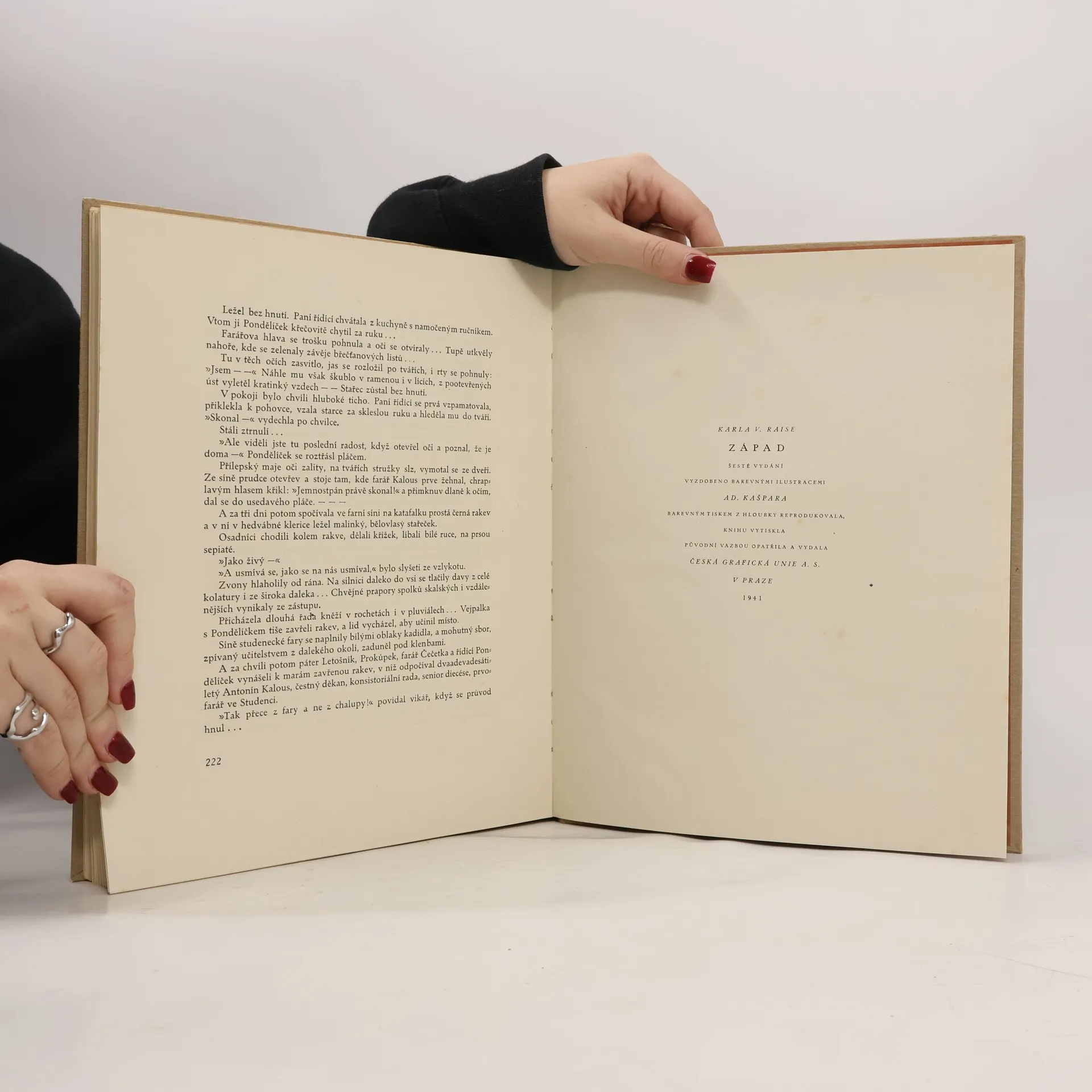 Román Západ (1899), stěžejní dílo velkého spisovatele, se dosud ocital ve stínu autorových románů „líbivějších“ (Zapadlí vlastenci) a „čtivějších“ (Kalibův zločin). Autor mnoha populárních povídek a románů, řazený v učebnicových přehledech mezi realistické zpodobitele venkova, zde v komorním příběhu starého faráře zachycuje nejen atmosféru zapadlého koutu Vysočiny, ale i psychologické drama stáří, zodpovědnosti k obci a vlastní práci pro ni. Dosavadní vydání Raisova románu doprovázely tradiční, románu poněkud odlehlé ilustrace Kašparovy. Současné vydání, připravené edičně Robertem Adamem a opatřené komentářem prof. Jaroslavy Janáčkové, vyjde poprvé s ilustracemi Raisova osobního přítele Antonína Slavíčka. Ilustrace z fondů roudnické Galerie moderního umění, reprodukované na zvláštním křídovém papíře, zpřítomňují drsný a přece poetický kraj Hlinecka.