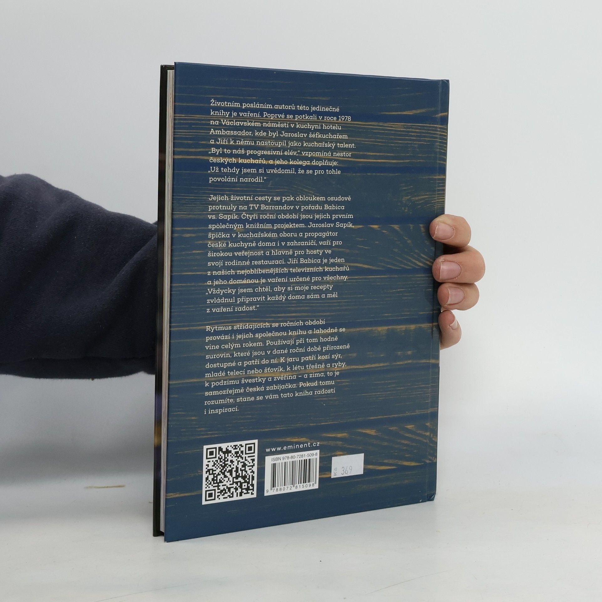 Životním posláním autorů této jedinečné knihy je vaření. Poprvé se potkali v roce 1978, na Václavském náměstí v kuchyni hotelu Ambassador, kde byl Jaroslav šéfkuchařem a Jiří k němu nastoupil jako kuchařský talent. „Byl to náš progresivní elév,“ vzpomíná nestor českých kuchařů a jeho kolega doplňuje: „Už tehdy jsem si uvědomil, že se pro tohle povolání narodil.“ Jejich životní cesty se pak obloukem osudově protnuly na Barrandově. Čtyři roční období jsou jejich prvním společným knižním projektem. Jaroslav Sapík, špička v kuchařském oboru a propagátor české kuchyně doma i v zahraničí, vaří pro širokou veřejnost a hlavně pro hosty ve svojí rodinné restauraci. Jiří Babica je jeden z našich nejoblíbenějších televizních kuchařů a jeho doménou je vaření určené pro všechny. „Vždycky jsem chtěl, aby si moje recepty zvládnul připravit každý doma sám a měl z vaření radost.“ Rytmus střídajících se ročních období provází i jejich společnou knihu a lahodně se vine celým rokem. Používají při tom hodně surovin, které jsou v dané roční době přirozeně dostupné a patří do ní. K jaru patří kozí sýr, mladé telecí nebo šťovík, k létu třešně a ryby, k podzimu švestky a zvěřina – a zima, to je samozřejmě česká zabijačka. Pokud tomu rozumíte, stane se vám tato kniha radostí i inspirací.