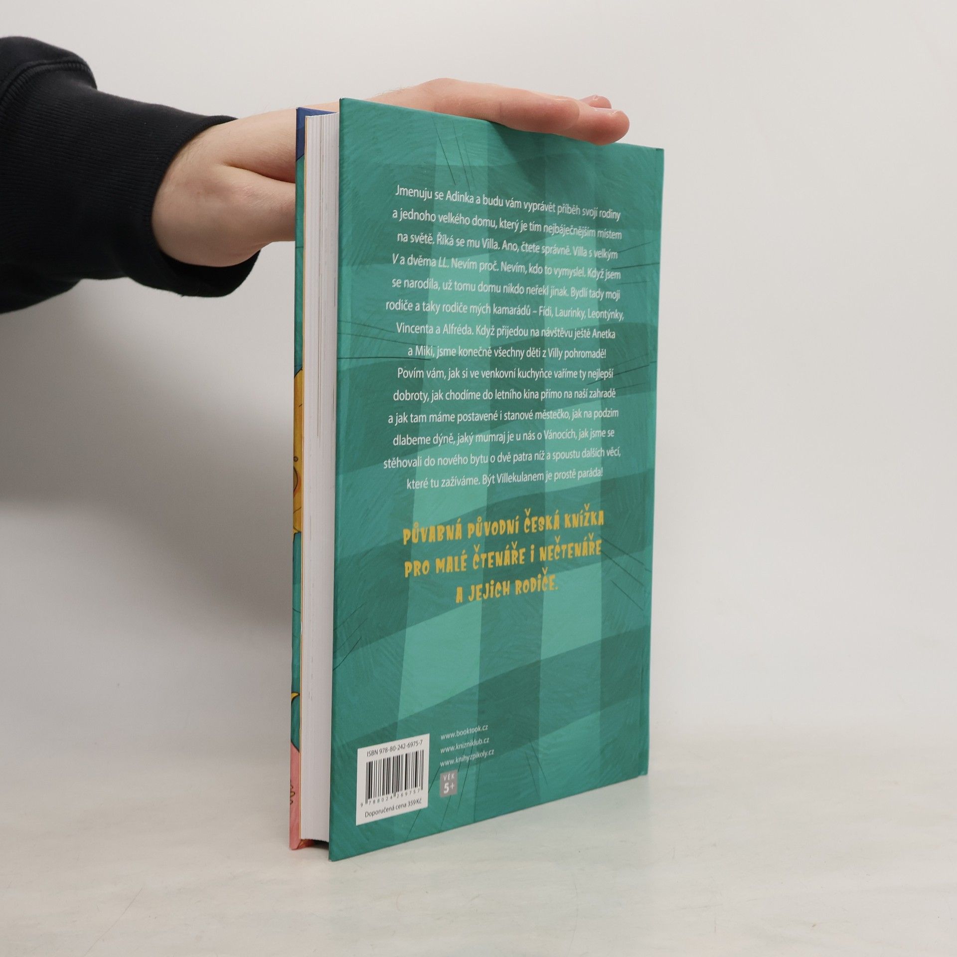 Jmenuju se Adinka a budu vám vyprávět příběh svojí rodiny a jednoho velkého domu, který je tím nejbáječnějším místem na světě. Říká se mu Villa. Ano, čtete správně. Villa s velkým V a dvěma LL. Nevím proč. Nevím, kdo to vymyslel. Když jsem se narodila, už tomu domu nikdo neřekl jinak. Bydlí tady moji rodiče a taky rodiče mých kamarádů – Fíďi, Laurinky, Leontýnky, Vincenta a Alfréda. Když přijedou na návštěvu ještě Anetka a Miki, jsme konečně všechny děti z Villy pohromadě! Povím vám, jak si ve venkovní kuchyňce vaříme ty nejlepší dobroty, jak chodíme do letního kina přímo na naší zahradě a jak tam mámě postavené i stanové městečko, jak na podzim dlabeme dýně, jaký mumraj je u nás o Vánocích, jak jsme se stěhovali do nového bytu o dvě patra níž a spoustu dalších věcí, které tu zažíváme. Být Villekulanem je prostě paráda! Kniha je určena dětem od 5 let.