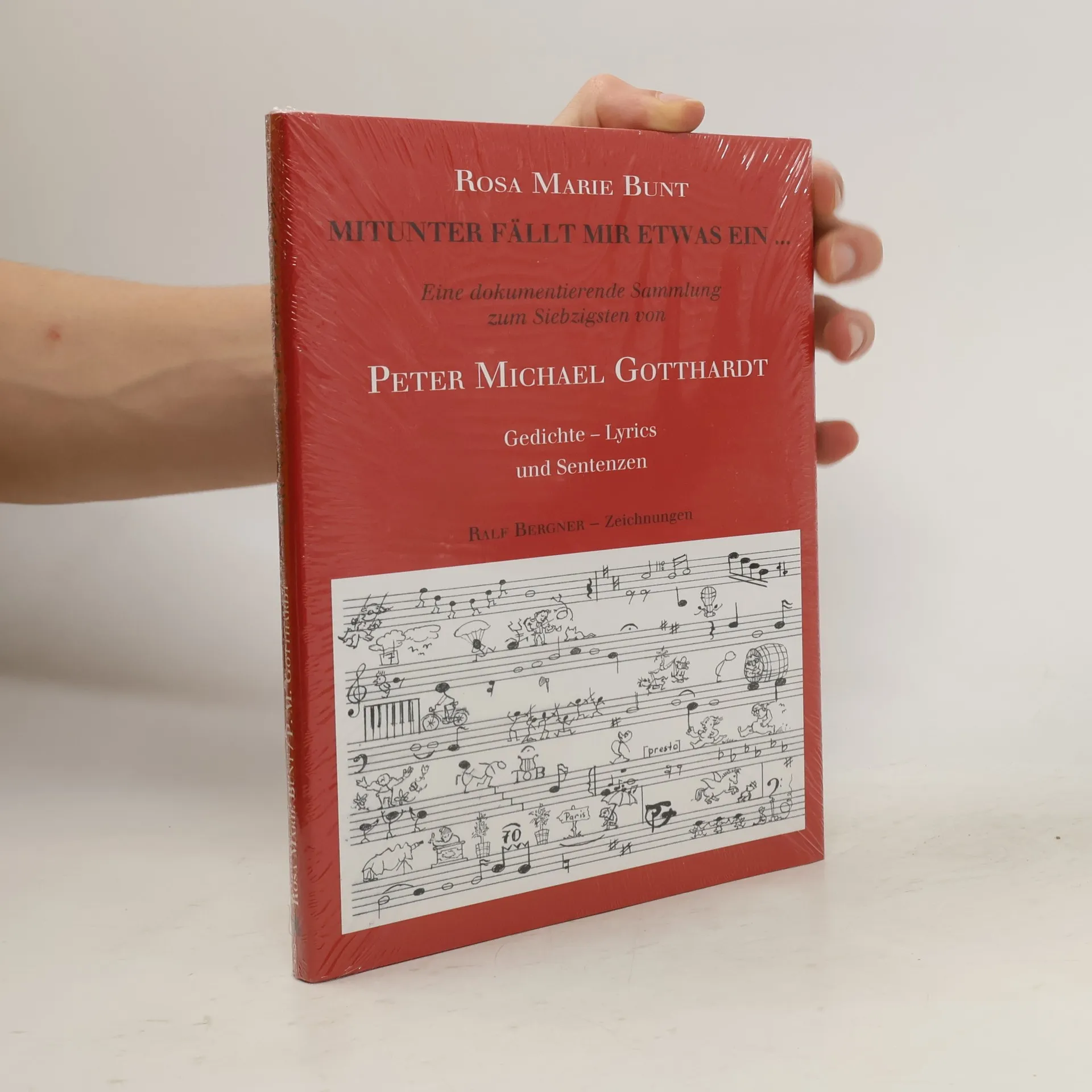'Mitunter fällt mir etwas ein.'. Eine Hommage an das unvollendete Lebenswerk des Komponisten Peter Michael Gotthardt. Mit mehr als 500 Filmmusiken, einer Oper, Schauspiel-, Ballett- und Theatermusiken, Chansons und Songs, die zu Legenden wurden, berührte es Menschen in aller Welt – und tut es noch heute. – Zum 70. Geburtstag des Magiers der Klänge durchwandert die Autorin und Herausgeberin Rosa Marie Bunt die Klaviatur von Leben und Laufbahn des unermüdlichen Schöpfergeistes, lässt Weggefährten zu Wort kommen und präsentiert mit leichter Hand einen Gotthardt, wie man ihn so nicht kennt: Eine dokumentierende Sammlung aus Künstler-Biografie sowie Gedichten, Lyrics und Sentenzen aus der Feder des Meisters geben Aufschluss –, bereichert durch eine 'wohltemperierte' Palette von Zeichnungen des im In- und Ausland geschätzten Malers und Grafikers Ralf Bergner.