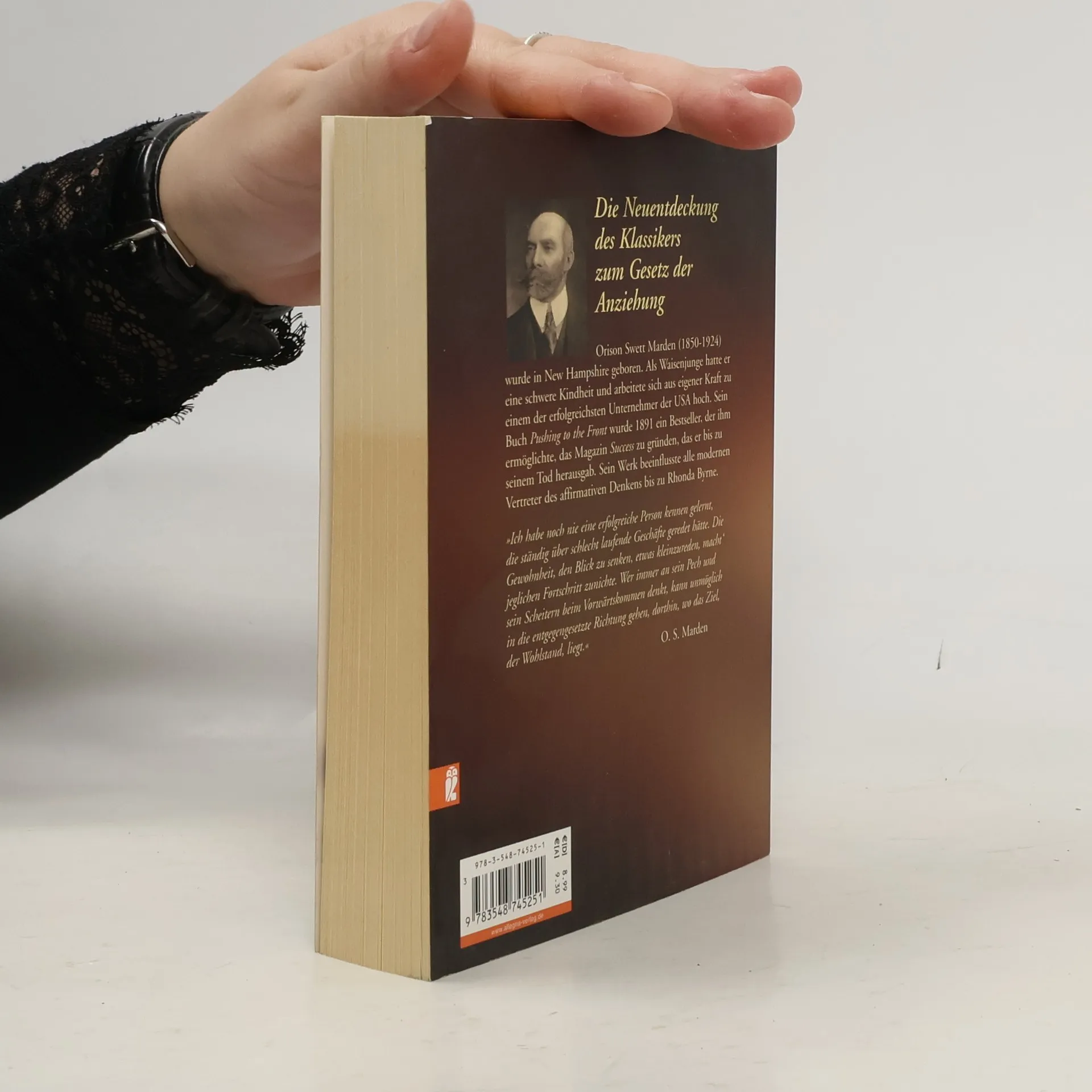 'Ich habe noch nie eine erfolgreiche Person kennen gelernt, die ständig über schlecht laufende Geschäfte geredet hätte. Die Gewohnheit, den Blick zu senken, etwas kleinzureden, macht jeglichen Fortschritt zunichte. Wer immer an sein Pech und sein Scheitern beim Vorwärtskommen denkt, kann unmöglich in die entgegen gesetzte Richtung gehen, dorthin, wo das Ziel, der Wohlstand, liegt.' O. S. Marden