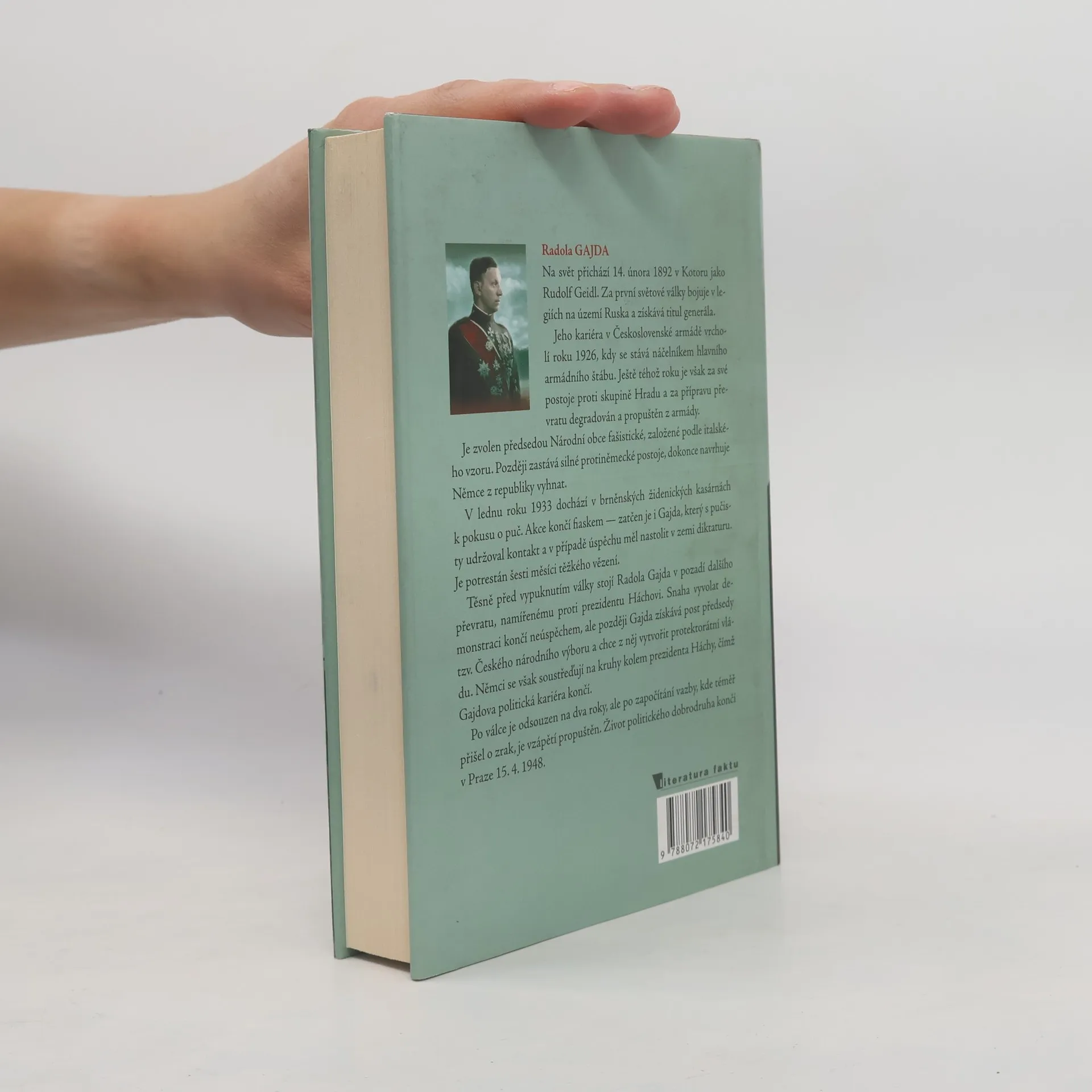 Rudolf Geidl, enfant terrible české meziválečné politiky, se narodil 14. února 1892 v Kotoru. Během první světové války velel 7. pluku československých legií v Rusku a po válce se stal generálem, působícím v sibiřské armádě admirála Kolčaka. Po válce studoval na francouzské Vysoké válečné škole a v roce 1926 se stal náčelníkem hlavního armádního štábu. Ještě téhož roku byl však degradován a propuštěn z armády za své postoje proti Masarykově skupině a za přípravu státního převratu. V roce 1926 založil Národní obec fašistickou (NOF), inspirovanou italským fašismem, polskými „pilsudčíky“ a německými nacisty. V lednu 1933 se podílel na neúspěšném židenickém puči, za což byl potrestán šesti měsíci vězení. Těsně před válkou plánoval další převrat proti prezidentu Háchovi, jehož rehabilitaci nedávno zažil. Demonstrace plánovaná na 14. března 1939 však nezískala podporu veřejnosti. Gajda usiloval o post předsedy Českého národního výboru, který měl potenciál stát se protektorátní vládou, ale jeho politická kariéra skončila, když se Němci zaměřili na Háchovy kruhy. Po válce byl odsouzen na dva roky, ale brzy propuštěn kvůli špatnému zacházení. Jeho život skončil v Praze 15. dubna 1948.