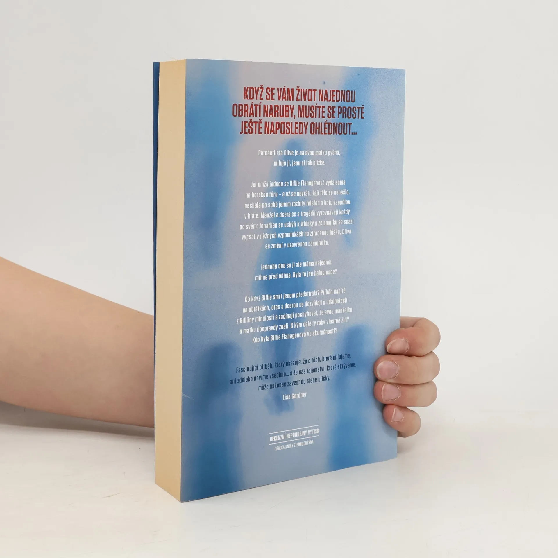 Před rokem se Billie Flanaganová vydala sama na horskou túru – a od té doby ji nikdo nespatřil. Záchranáři našli jen její rozbitý mobil a jednu pohorku, tělo ale ne. Manžela a dospívající dceru tragédie těžce zasáhne – Jonathan hledá útěchu v občasném pití, Olive se propadá do osamělosti a pronásledují ji podivné vidiny a halucinace, jako by její matka byla stále naživu. Její otec má o trápení víc… a vtom náhodou narazí na tajemství z minulosti, které před ním Billie dokázala skrýt. Jeho představy o vlastní ženě se zhroutí. Nakolik ji doopravdy znal? Kdo vlastně Billie Flanaganová byla? Olive se spolu s otcem snaží vypátrat pravdu, a to nejenom o Billie, ale také o sobě samých. Láska je někdy opravdu slepá a to, co nechceme vidět, prostě nevidíme. Zamysleli jsme se někdy nad rozdílem mezi dojmem, který jsme si utvořili o člověku, kterého milujeme, a tím, jaký ve skutečnosti je?