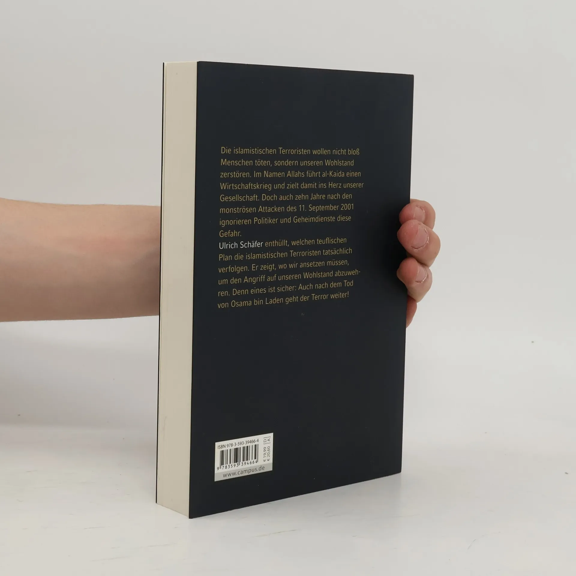 Die islamistischen Terroristen wollen nicht bloß Menschen töten, sondern unseren Wohlstand zerstören. Im Namen Allahs führt al-Kaida einen Wirtschaftskrieg und zielt damit ins Herz unserer Gesellschaft. Doch auch zehn Jahre nach den monströsen Attacken des 11. September 2001 ignorieren Politiker und Geheimdienste diese Gefahr. Ulrich Schäfer enthüllt, welchen teuflischen Plan die islamistischen Terroristen tatsächlich verfolgen. Er zeigt, wo wir ansetzen müssen, um den Angriff auf unseren Wohlstand abzuwehren. Denn eines ist sicher: Auch nach dem Tod von Osama bin Laden geht der Terror weiter!