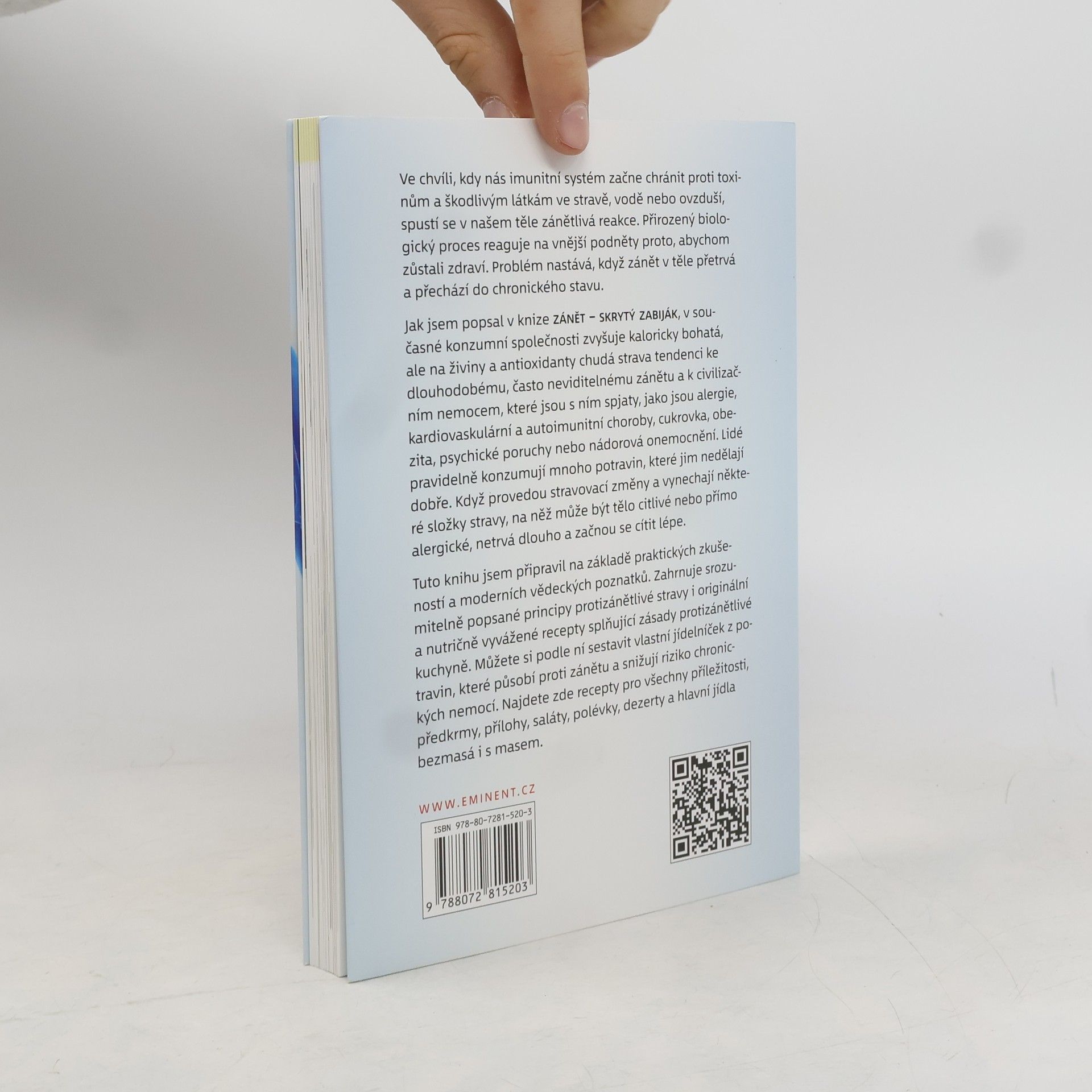 Ve chvíli, kdy nás imunitní systém začne chránit proti toxinům a škodlivým látkám ve stravě, vodě nebo ovzduší, spustí se v našem těle zánět. Jako přirozený biologický proces reaguje na vnější podněty proto, abychom zůstali zdraví. Problém nastává tehdy, když v těle přetrvává a přechází do chronického stavu. Jak autor popsal ve své knize Zánět - skrytý zabiják, zvyšuje kaloricky bohatá, na živiny a antioxidanty chudá strava v současné konzumní společnosti tendenci k dlouhodobému a často neviditelnému zánětu a s ním spojených civilizačních nemocí, jako jsou alergie, autoimunitní nemoci, cukrovka, obezita, srdečněcévní nemoci, psychické poruchy nebo nádorová onemocnění. Lidé pravidelně konzumují mnoho potravin, které jim nedělají dobře. Po provedení stravovacích změn a vynechání některých druhů, na které může tělo být citlivé nebo přímo alergické, zpravidla netrvá dlouho a začnou se cítit lépe. Tuto knihu jsem autor připravoval na základě praktických zkušeností a moderních vědeckých poznatků. Zahrnuje srozumitelně popsané principy protizánětlivé stravy i originální a nutričně vyvážené recepty splňující zásady protizánětlivé stravy. Je návodem, který vám pomůže sestavit si vlastní jídelníček z potravin, které působí protizánětlivě a snižují riziko chronických nemocí. Najdete zde recepty pro všechny příležitosti, předkrmy, přílohy, saláty, polévky, hlavní jídla bezmasá i s masem a dezerty.