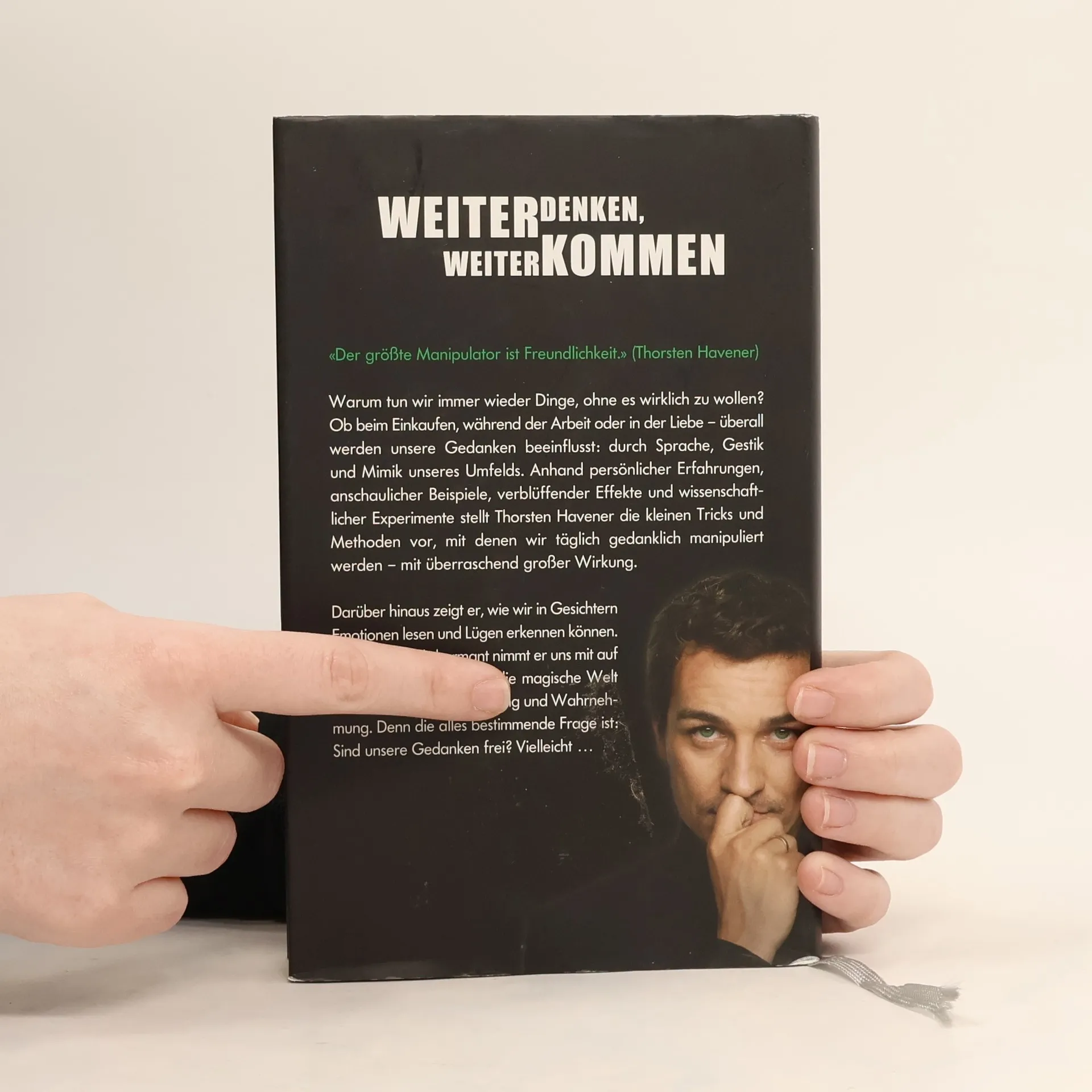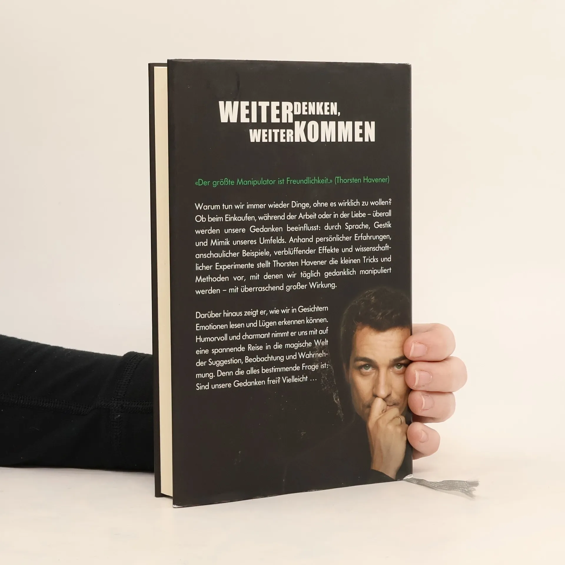 WEITER DENKEN, WEITER KOMMEN«Der größte Manipulator ist Freundlichkeit.» (Thorsten Havener)Warum tun wir immer wieder Dinge, ohne es wirklich zu wollen? Ob beim Einkaufen, während der Arbeit oder in der Liebe – überall werden unsere Gedanken beeinflusst: durch Sprache, Gestik und Mimik unseres Umfelds. Anhand persönlicher Erfahrungen, anschaulicher Beispiele, verblüffender Effekte und wissenschaftlicher Experimente stellt Thorsten Havener die kleinen Tricks und Methoden vor, mit denen wir täglich gedanklich manipuliert werden – mit überraschend großer Wirkung.Darüber hinaus zeigt er, wie wir in Gesichtern Emotionen lesen und Lügen erkennen können. Humorvoll und charmant nimmt er uns mit auf eine spannende Reise in die magische Welt der Suggestion, Beobachtung und Wahrnehmung. Denn die alles bestimmende Frage ist: Sind unsere Gedanken frei? Vielleicht …