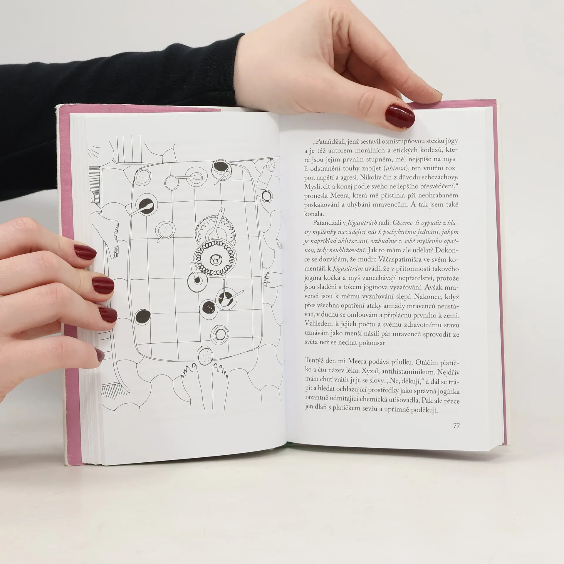 aneb Od večírků k nirváně. Vydejte se s Šárkou do indického ášramu najít sebe sama! Měli jste někdy chuť se vším praštit a obrátit svůj život naruby? Přesně to udělá Šárka, když se vydá do indického ášramu na kurz lektorky jógy. Prodá svůj jediný majetek, staré otlučené clio, a vstoupí do tělesného i duchovního výcviku, který změní celé její dosavadní chápání života. Musí čelit svým skrytým obavám, návalům vzteku a bolestným vzpomínkám. Cesta k sobě samé je ale nejen trnitá, je také pestrá a plná vůní jako Indie sama. Knížka seznamuje čtenáře s učením jógy coby filozofickým směrem i způsobem života, a může tak sloužit k hlubšímu seznámení s jógou.
