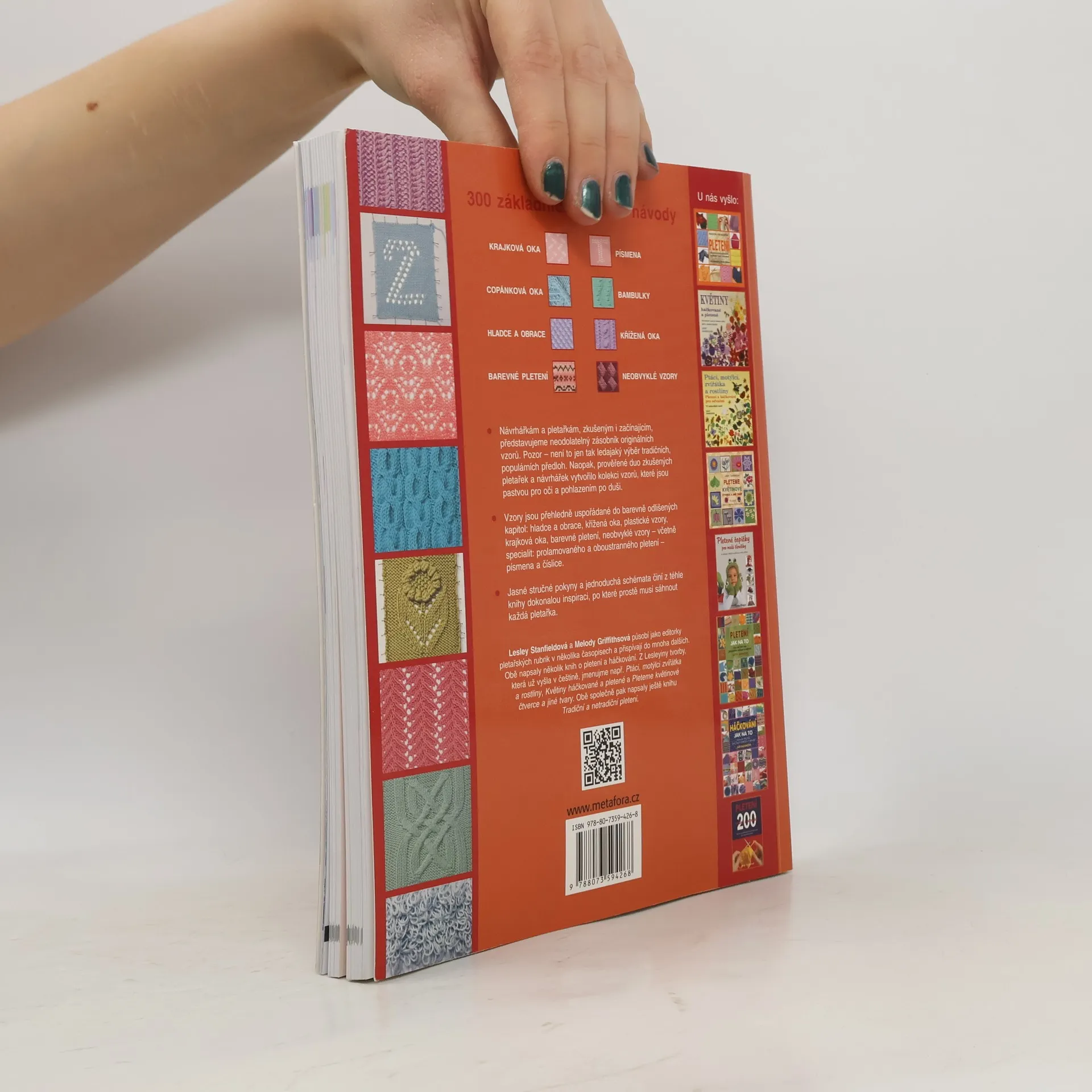 Nápaditý průvodce 300 vzory k pletení, které musíte vyzkoušet – žhavé novinky i nadčasová klasika. Publikace poslouží jako výjimečný zdroj neotřelých nápadů pletařkám všech úrovní pokročilosti. Ani na přeplněném trhu a v obrovské konkurenci se Pletené vzory neztratí, protože se jedná o jedinečnou knihu. Při její přípravě se spojily dvě zkušené návrhářky vzorů ručního pletení a vytvořily dosud nevídanou sbírku vzorů. Každý si přijde na své. Nebude zklamán ani ten, kdo by hledal klasické vzory. Ovšem pravý poklad spočívá v nových předlohách, které nenajdete v žádné jiné knize. Vzory jsou pro přehlednost rozděleny do devíti barevně odlišených kapitol, jsou označeny stupněm obtížnosti a seskupeny podle techniky pletení: hladce a obrace, pružné vzory, křížená oka, copánky, krajkové vzory, bambulky, barevné proužky, norské vzory, neobvyklé vzory – včetně zajímavostí, jako je prolamované a oboustranné pletení – a písmena a číslice. Tato kniha je zkrátka nezbytností pro každou zapálenou pletařku.