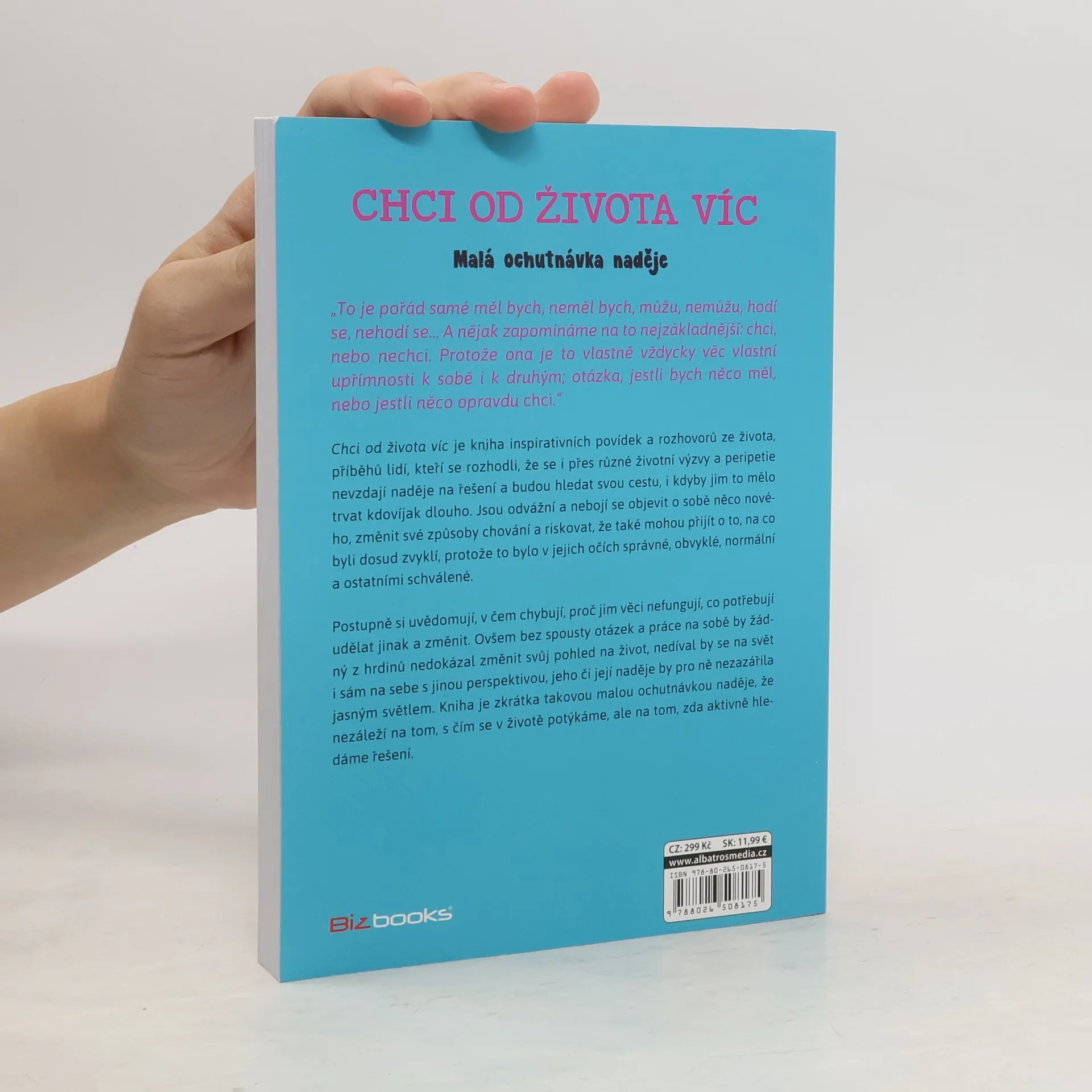 Chci od života víc je kniha inspirativních povídek a rozhovorů ze života, příběhů lidí, kteří se rozhodli, že se i přes různé životní peripetie a zapeklitosti nevzdají naděje na řešení a budou hledat svou cestu, i kdyby jim to mělo trvat třeba tisíc let. Jsou odvážní a nebojí se zjistit o sobě něco nového, změnit způsoby chování a riskovat, že také mohou přijít o to, na co byli dosud zvyklí, protože to bylo v jejich očích správné, obvyklé, normální a ostatními schválené. Postupně si uvědomují, v čem chybují, proč jim věci nefungují, co potřebují udělat jinak a změnit. Ovšem bez spousty otázek, práce na sobě, konzultací a sebezkušenostních seminářů by žádný z hrdinů nedokázal změnit svůj pohled na život, nedíval by se na svět i sám na sebe s jinou perspektivou, jeho či její naděje by pro ně nezazářila jasným světlem. Kniha je zkrátka takovou Malou ochutnávkou naděje, že nezáleží na tom, s čím se v životě potýkáme, ale na tom, zda aktivně hledáme řešení.