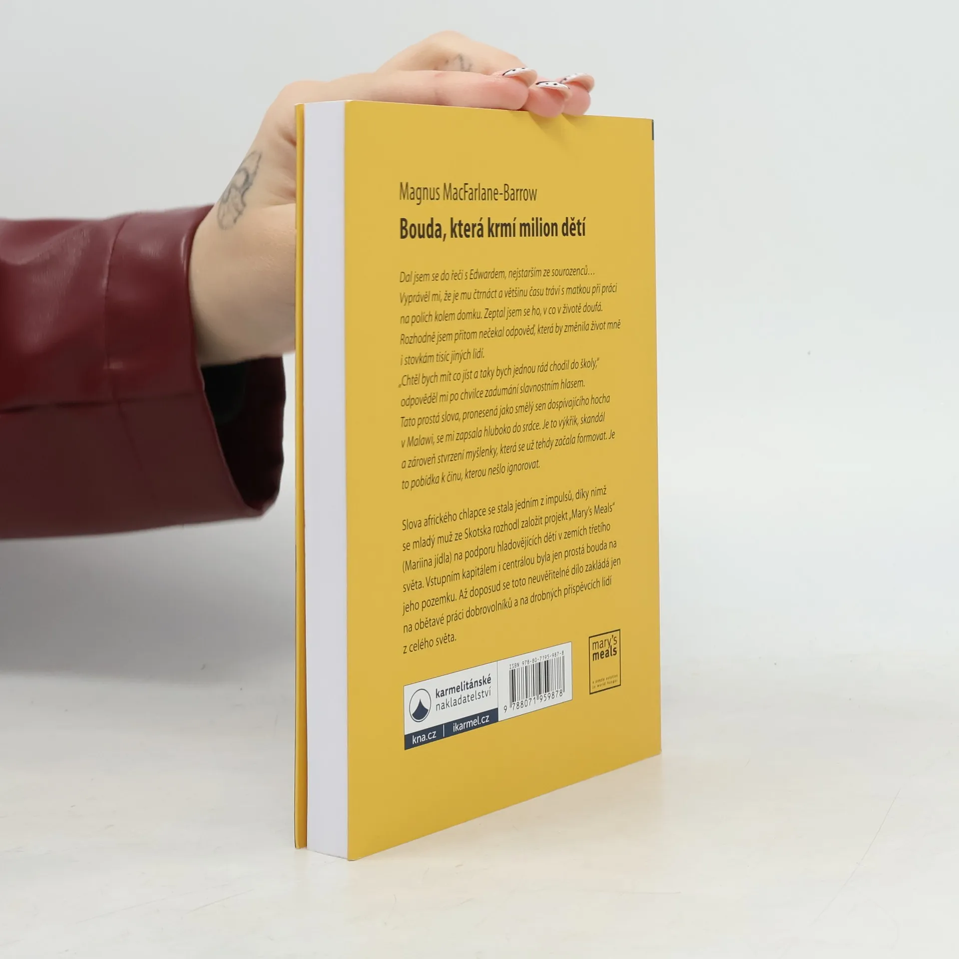 Dal jsem se do řeči s Edwardem, nejstarším ze sourozenců. Jeho černé tričko bylo o několik čísel větší, než by potřeboval, ale na rozdíl od umazaných a potrhaných hadrů, do kterých byli zahaleni jeho sourozenci, bylo čisté. Vyprávěl mi, že je mu čtrnáct a většinu času tráví s matkou při práci na polích kolem domku. Zeptal jsem se ho, v co v životě doufá. Rozhodně jsem přitom nečekal odpověď, která by změnila život mně i stovkám tisíc jiných lidí. „Chtěl bych mít co jíst a taky bych jednou rád chodil do školy,“ odpověděl mi po chvilce zadumání slavnostním hlasem. Tato prostá slova, pronesená jako smělý sen dospívajícího hocha v Malawi, se mi zapsala hluboko do srdce. Je to výkřik, skandál a zároveň stvrzení myšlenky, která se už tehdy začala formovat, je to pobídka k činu, kterou nešlo ignorovat. Slova čtrnáctiletého afrického chlapce se stala jedním z impulsů, po nichž se introvertní chovatel ryb ze skotské vysočiny rozhodl založit „Mariino jídlo“: organizaci, která stojí na drobných příspěvcích deseti tisíců lidí a dobrovolnické službě, díky nimž krmí každý den přes milion dětí ve více než tisícovce škol čtrnácti zemí rozvojového světa. Tento nesmírně poutavý příběh, jak z počátečního nadšení hrstky dobrovolníků vyrostlo dílo mezinárodních rozměrů, vypráví o obětavosti a o vynalézavé pomoci lidí, jimž není lhostejný osud těch, kteří hladoví a prožívají utrpení.