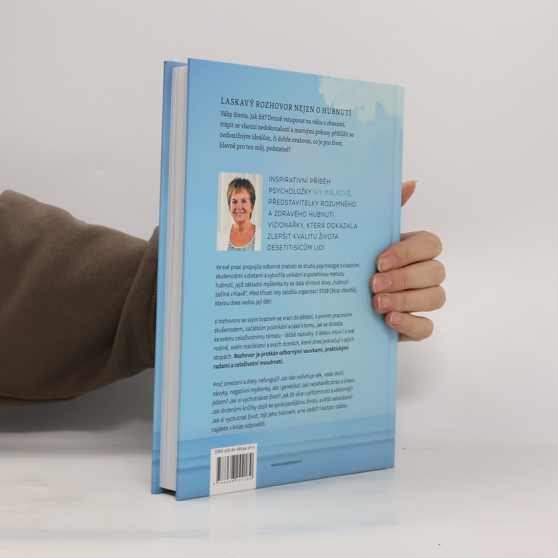 Váhy života. Jak žít? Denně vstupovat na váhu s obavami, trápit se vlastní nedokonalostí a marnými pokusy přiblížit se nedostižným ideálům, či dobře zvažovat, co je pro život, hlavně pro ten můj, podstatné? Inspirativní příběh psycholožky, představitelky rozumného a zdravého hubnutí, vizionářky, která dokázala zlepšit kvalitu života desetitisícům lidí. Ve své praxi propojila odborné znalosti ze studia psychologie s vlastními zkušenostmi s dietami a vytvořila unikátní a spolehlivou metodu hubnutí, jejíž základní myšlenka by se dala shrnout slovy "hubnutí začíná v hlavě". Před třiceti lety založila organizaci STOB (Stop obezitě), kterou dnes vedou její děti. V rozhovoru se svým bratrem se vrací do dětství, k prvním pracovním zkušenostem, začátkům podnikání a také k tomu, jak se dostala ke svému celoživotnímu tématu - léčbě nadváhy. S láskou mluví i o své rodině, svém manželství a svých dcerách, které dnes pokračují v jejích stopách. Rozhovor je protkán odbornými vsuvkami, praktickými radami a celoživotní moudrostí. Proč omezení a diety nefungují? Jak nás ovlivňuje věk, naše okolí, návyky, negativní myšlenky, ale i genetika? Jak nezahánět stres a únavu jídlem? Jak si vychutnávat život? Jak žít více v přítomnosti a vědoměji? Jak drobnými krůčky dojít ke spokojenějšímu životu a větší sebelásce? Jak si vychutnat život, být jeho tvůrcem, a ne obětí? I na tyto otázky najdete v knize odpovědi.
