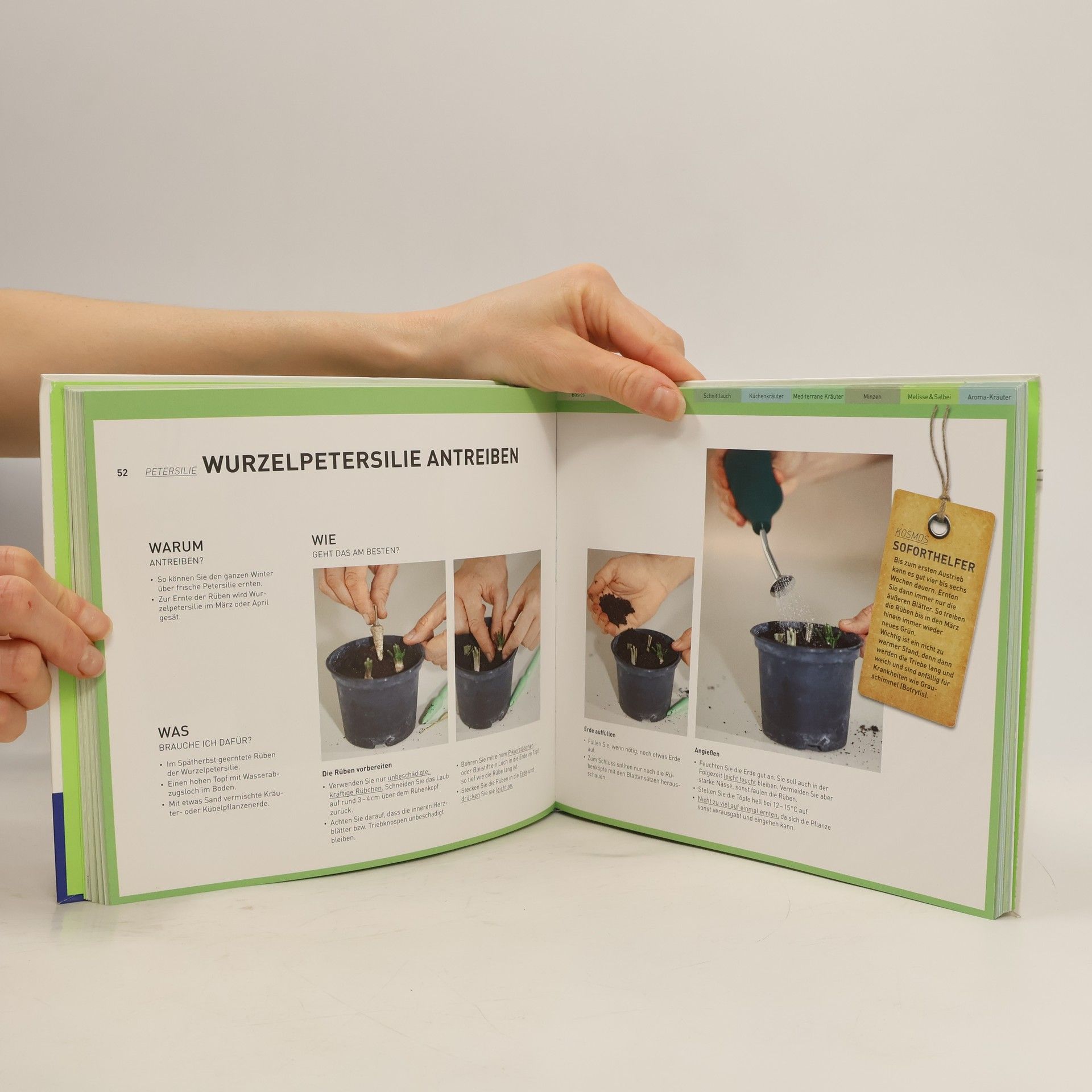 Erst Pflanzen kaufen, sich dann informieren – diesem geänderten Verbraucherverhalten tragen die Kosmos-Soforthelfer Rechnung und halten, was ihr Name verspricht: man steigt direkt über das Problem, die Frage oder den Wunsch ein und findet sofort konkrete Antworten, die wirklich weiterhelfen. Kein lästiges Blättern, kein Durchstöbern von Querverweisen, kein Durcharbeiten allgemeiner Texte, sondern schnelle Hilfe und ein intuitiver Zugriff auf Informationen. Schatten- oder Sonnenplatz für eine gute Kräuterernte? Durch schnelle Antworten auf typische Fragen wie diese, werden die Soforthelfer zu unverzichtbaren Ratgebern für Pflanzenfreunde.