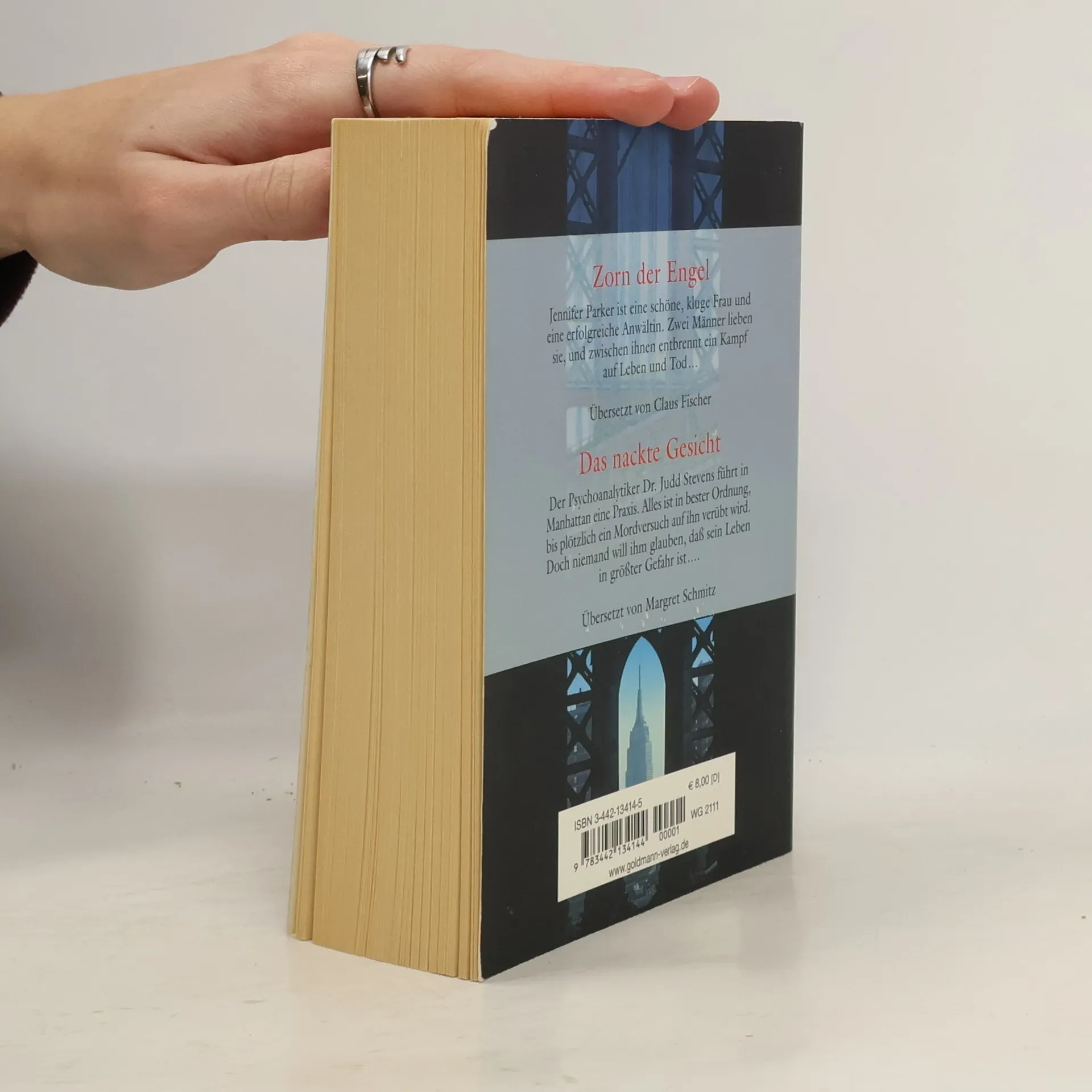Zorn der Engel: Jennifer Parker, vierundzwanzig, eine schöne und kluge junge Anwältin, hat gerade ihre Stellung als Assistentin des New Yorker Staatsanwalts angetreten. Gleich am ersten Tag wartet ein spektakuläres Verfahren auf sie: der Prozeß gegen Michael Moretti, den zur Zeit erfolgreichsten jungen Mafiaboß. Und dieser Tag wird beinahe auch der letzte in der Karriere Jennifers - sie gerät in den Verdacht, selber im Sold der Mafia zu stehen. So beginnt dieser glänzend geschriebene Roman um eine Frau, die später eine der besten Strafverteidigerinnen Amerikas wird, aber auch um die beiden Männer in ihrem Leben, um den verheirateten Adam Warner, der für die Präsidentschaft kandidiert und sich Skandale nicht leisten kann, und um Michael Moretti, den "schwarzen Engel", von dem sie abhängig zu werden droht ... Das nackte Gesicht: Er ist in tödlicher Gefahr, doch niemand glaubt ihm. Der Psychoanalytiker Judd Stevens gerät in den Verdacht, einen Patienten ermordet zu haben. Seinen Verfolgern schutzlos ausgeliefert, bleibt ihm schließlich nur noch eine einzige Waffe: sein psychologisches Wissen, das es ihm ermöglicht, das wahre Gesicht seines Gegners zu entlarven.