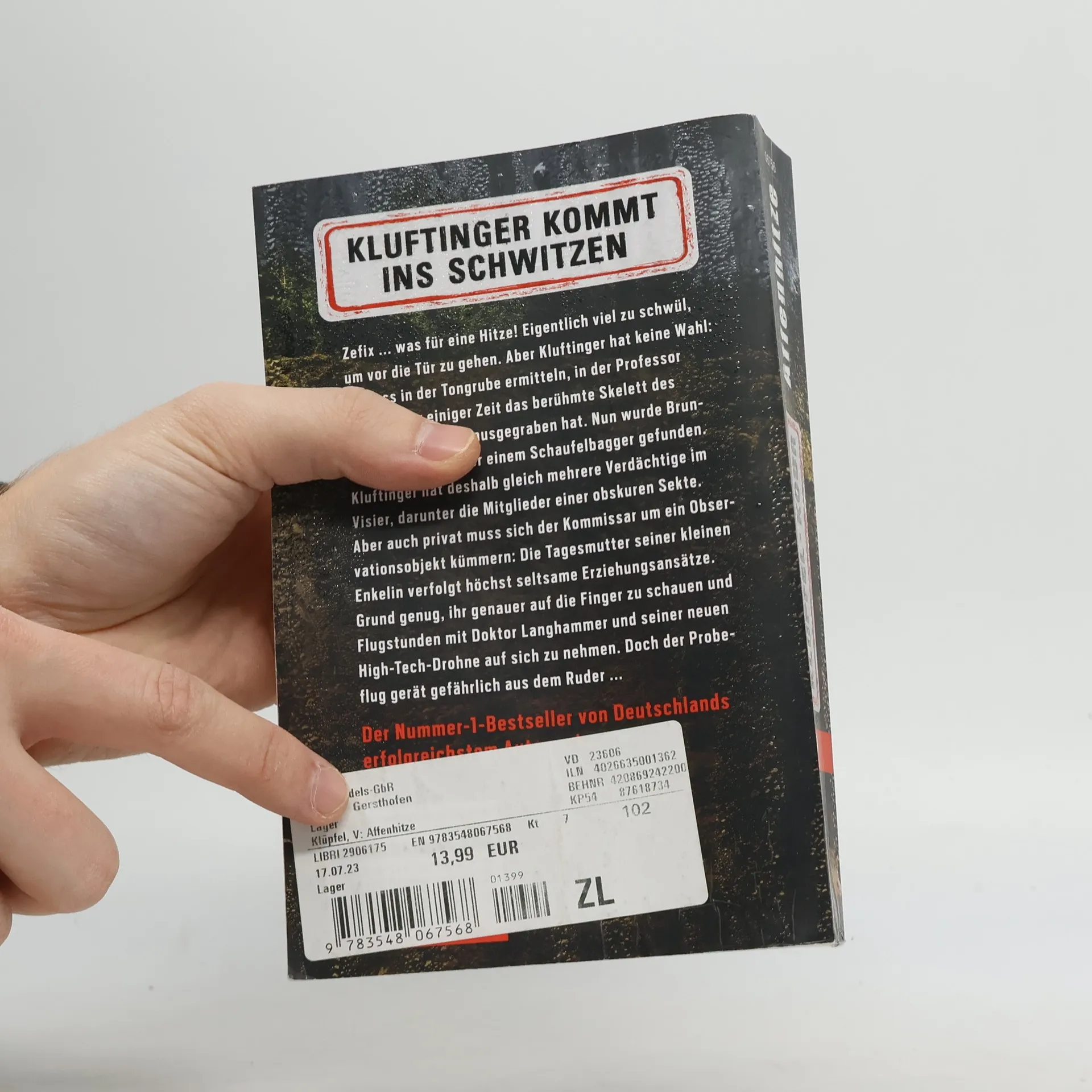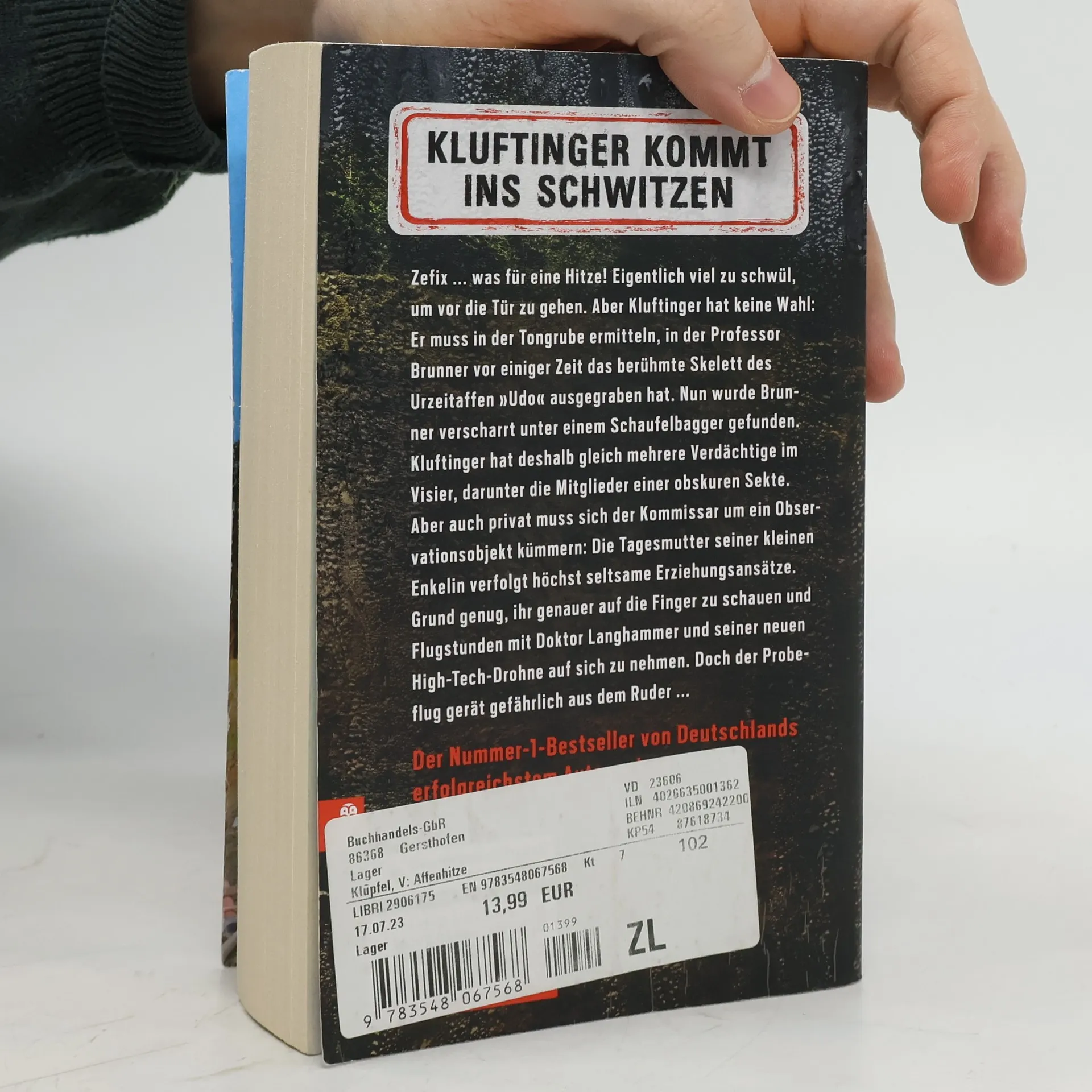 Kluftinger kommt ins Schwitzen Zefix ... was für eine Hitze! Eigentlich viel zu schwül, um vor die Tür zu gehen. Aber Kluftinger hat keine Wahl: Er muss in der Tongrube ermitteln, in der Professor Brunner vor einiger Zeit das berühmte Skelett des Urzeitaffen „Udo“ ausgegraben hat. Nun wurde Brunner verscharrt unter einem Schaufelbagger gefunden. Der Wissenschaftler, der mit seinem Fund beweisen wollte, dass die Wiege der Menschheit im Allgäu liegt, hatte viele Feinde. Kluftinger hat deshalb gleich mehrere Verdächtige im Visier, darunter die Mitglieder einer obskuren Sekte. Aber auch privat muss sich der Kommissar um ein Observationsobjekt kümmern: Die Tagesmutter seiner kleinen Enkelin verfolgt höchst seltsame Erziehungsansätze. Grund genug, ihr genauer auf die Finger zu schauen und Flugstunden mit Doktor Langhammer und seiner neuen High-Tech-Drohne auf sich zu nehmen. Doch der Probeflug gerät gefährlich aus dem Ruder ...