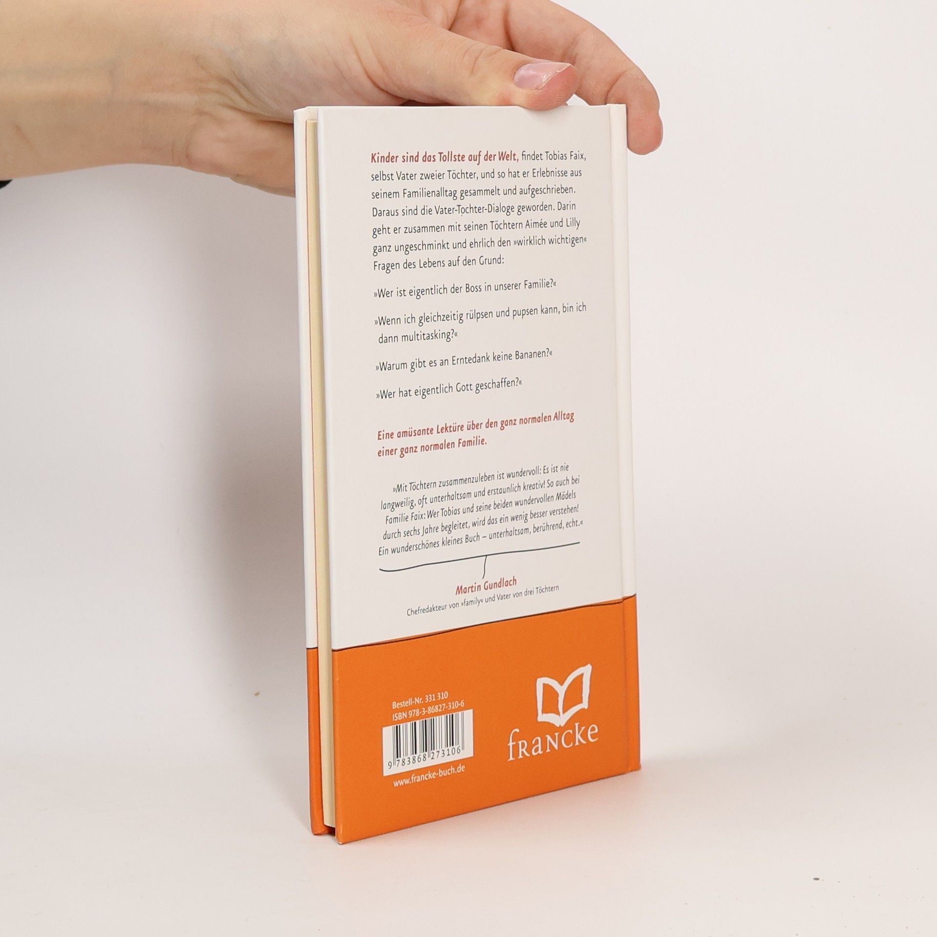 Kinder sind das Tollste auf der Welt, findet Tobias Faix, selbst Vater zweier Töchter, und so hat er Erlebnisse aus seinem Familienalltag gesammelt und aufgeschrieben. Daraus sind die „Vater-Tochter-Dialoge“ geworden. Darin geht er zusammen mit seinen Töchtern Aimée und Lilly ganz ungeschminkt und ehrlich den „wirklich wichtigen“ Fragen des Lebens auf den Grund: • „Wer ist eigentlich der Boss in unserer Familie?“ • „Wenn ich gleichzeitig rülpsen und pupsen kann, bin ich dann multitasking?“ • „Warum gibt es an Erntedank keine Bananen?“ • „Wer hat eigentlich Gott geschaffen?“ Eine amüsante Lektüre über den ganz normalen Alltag einer ganz normalen Familie.